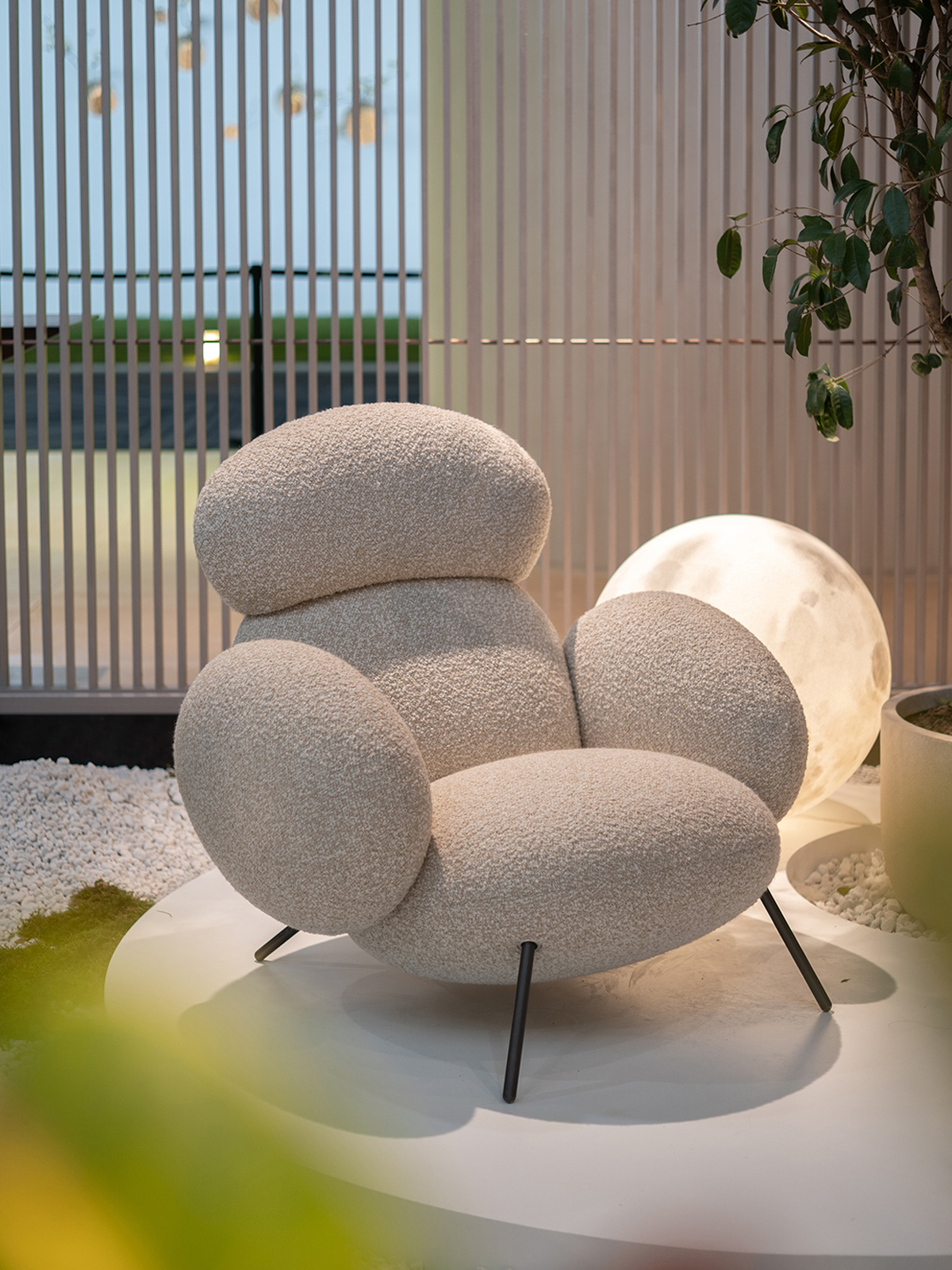 Pebble chair is defined by its organic, voluminous forms that offering an ultimate relaxing, lounging experience just like sitting on a pile of pebbles. It embraces the sitter like mother who are always generous and accepting.