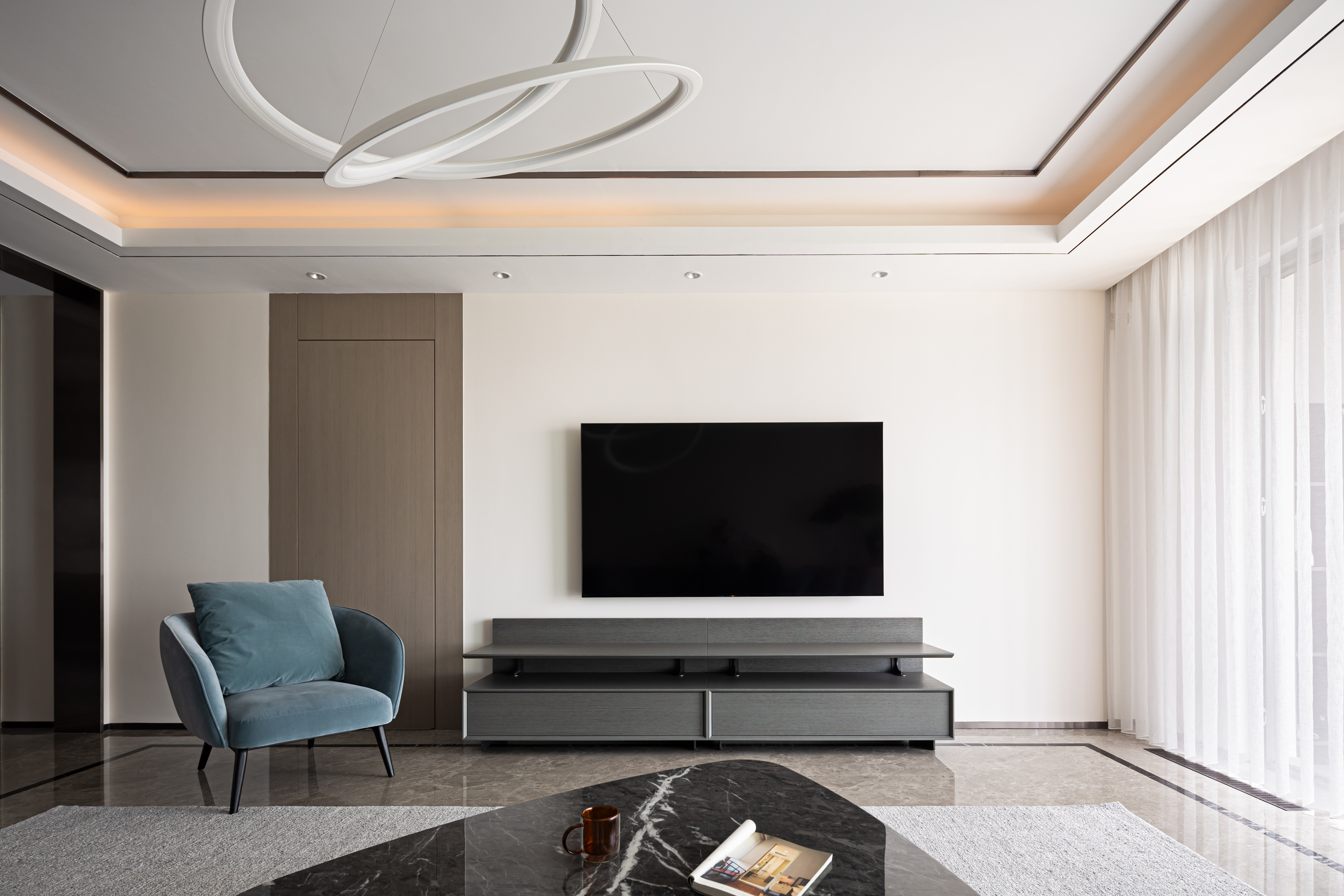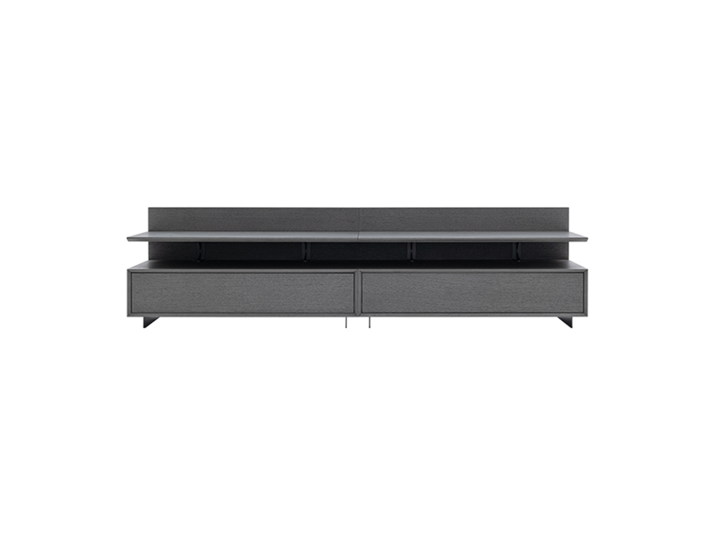 TV stand made in wood with metal feet in dark grey epoxy paint finish.