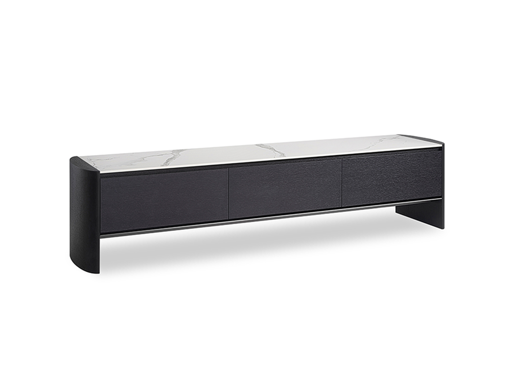 Side panel and drawers are made of wood, top made of sintered stone, bottom decorated with black color titanium rail.