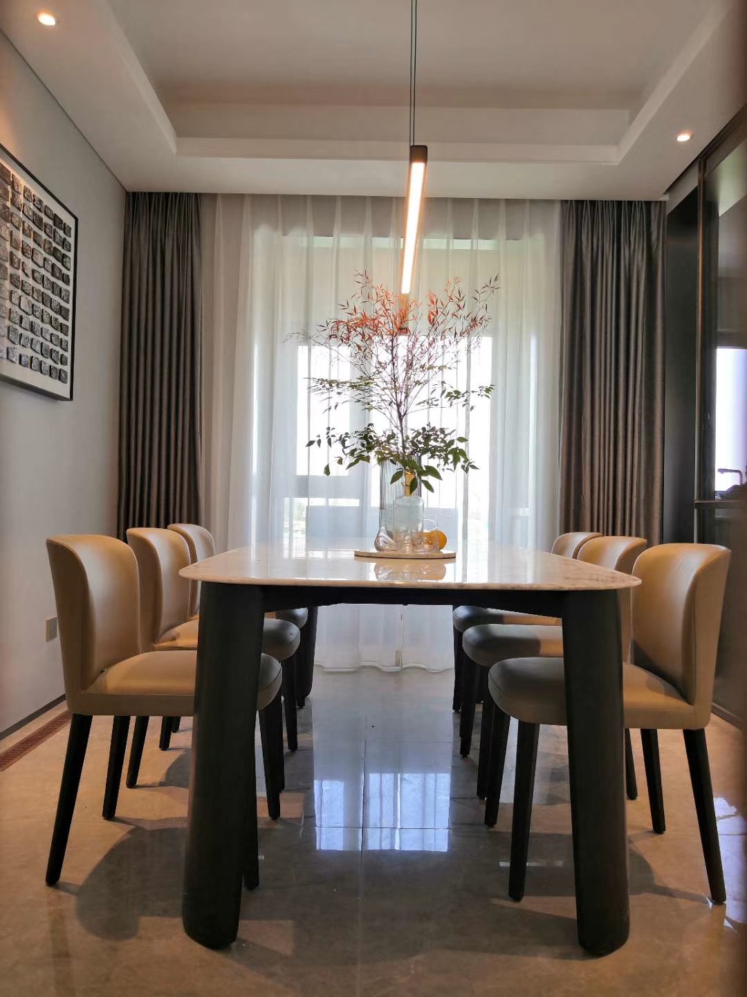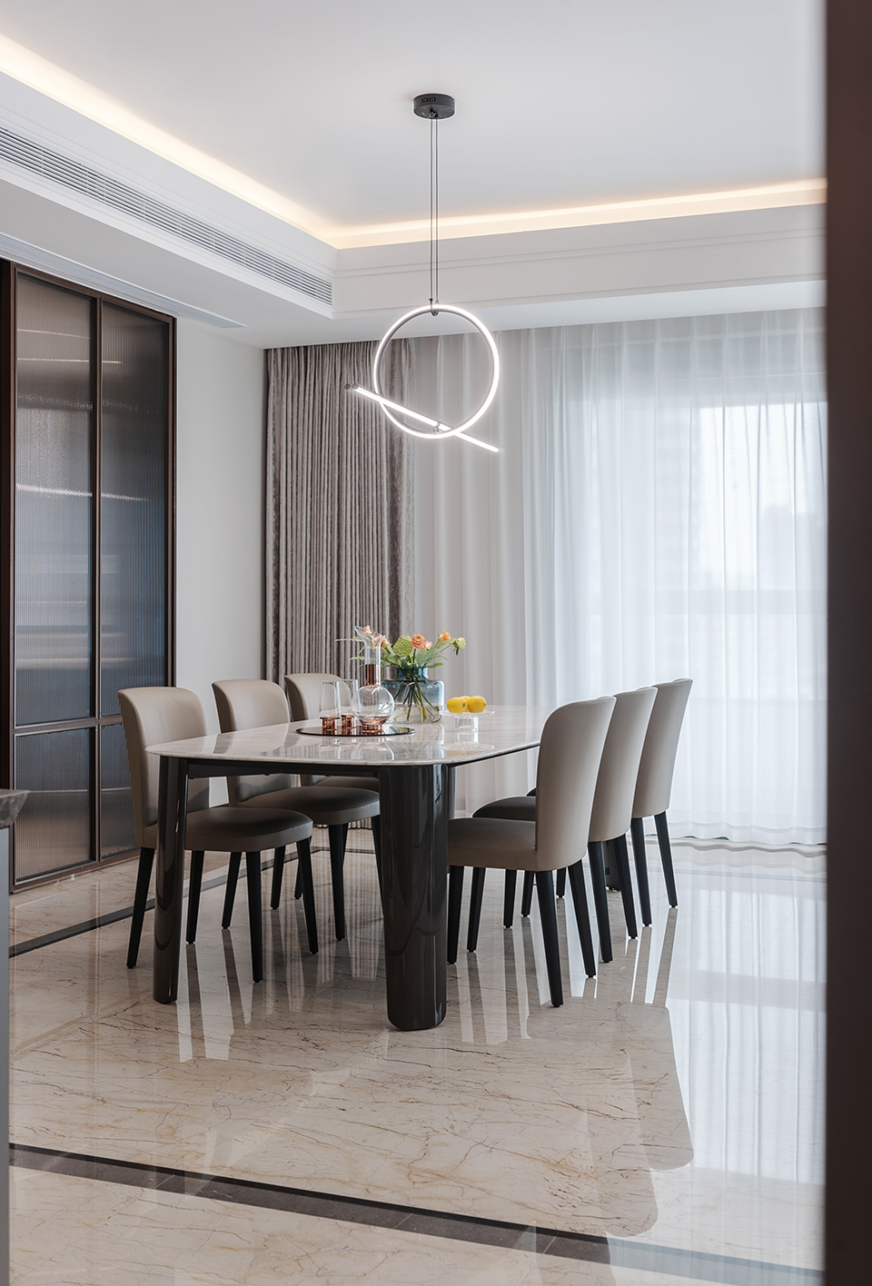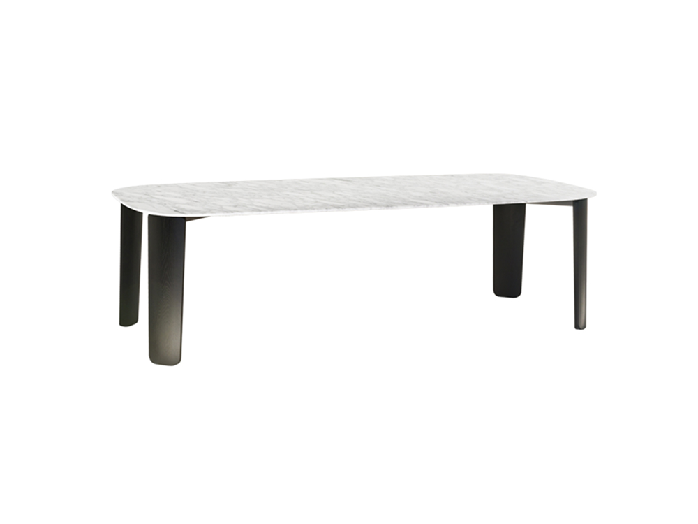 Dining table top in marble or wood. Solid wood legs in colored lacquer finish.
