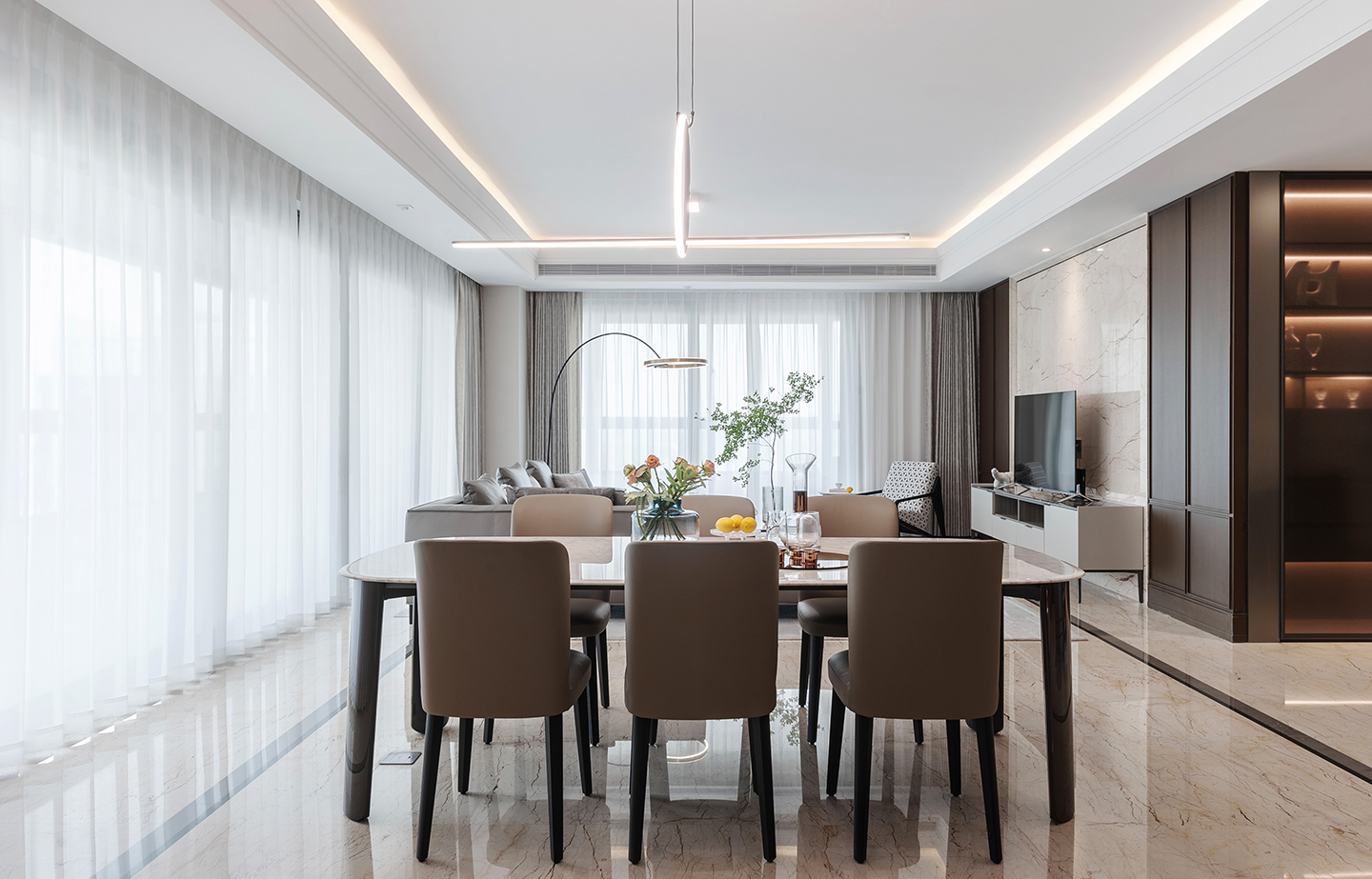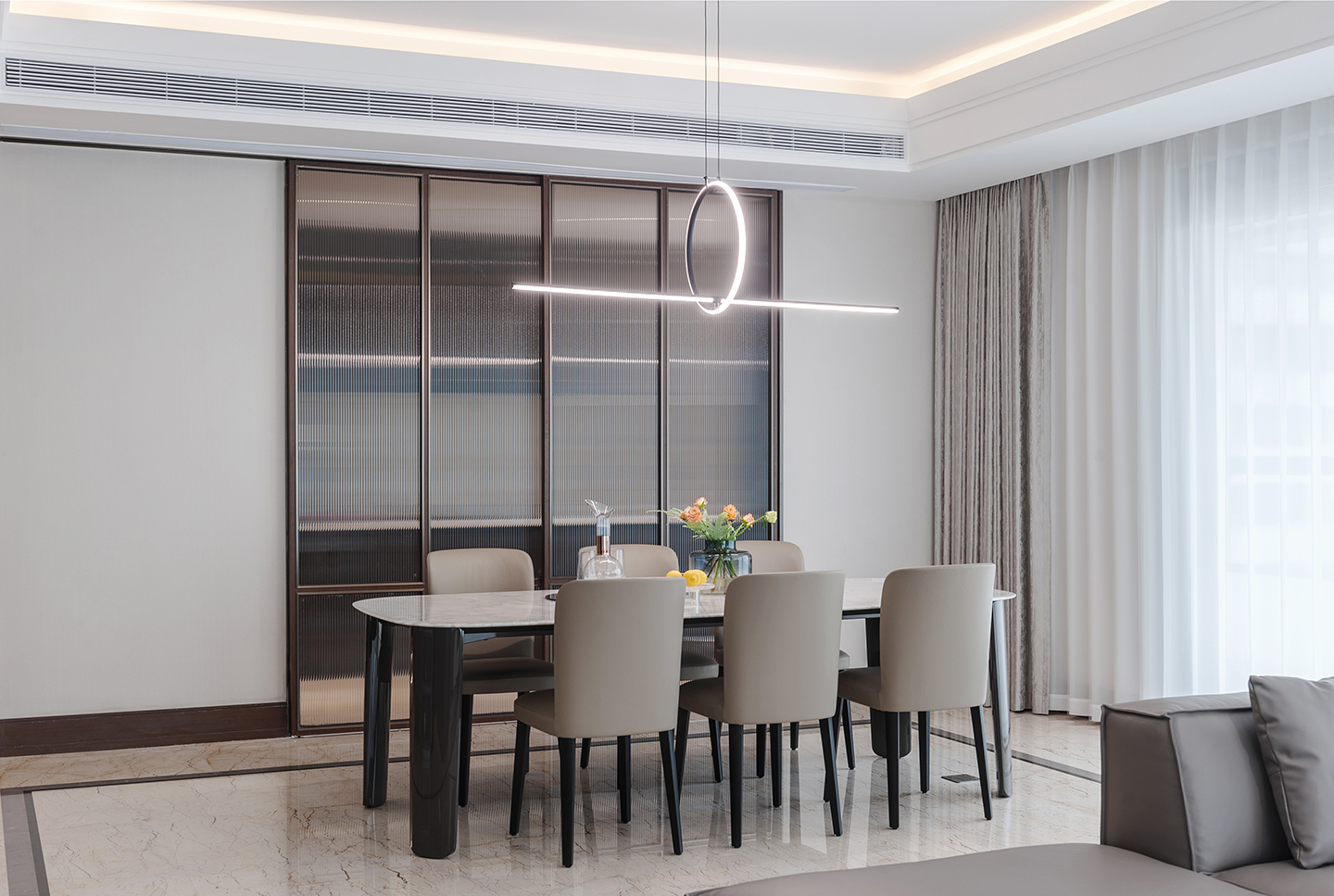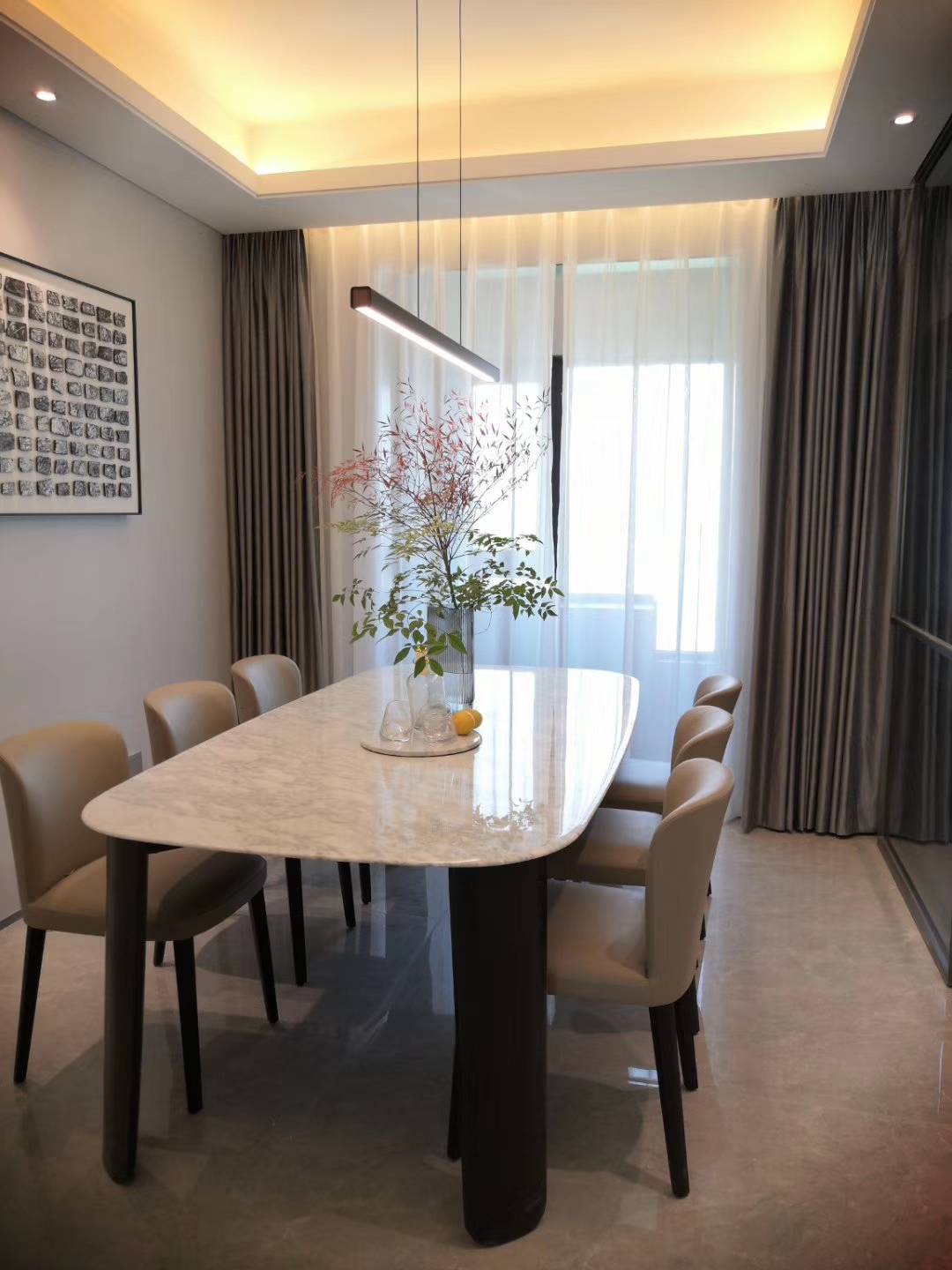 Dining table top in marble or wood. Solid wood legs in colored lacquer finish.