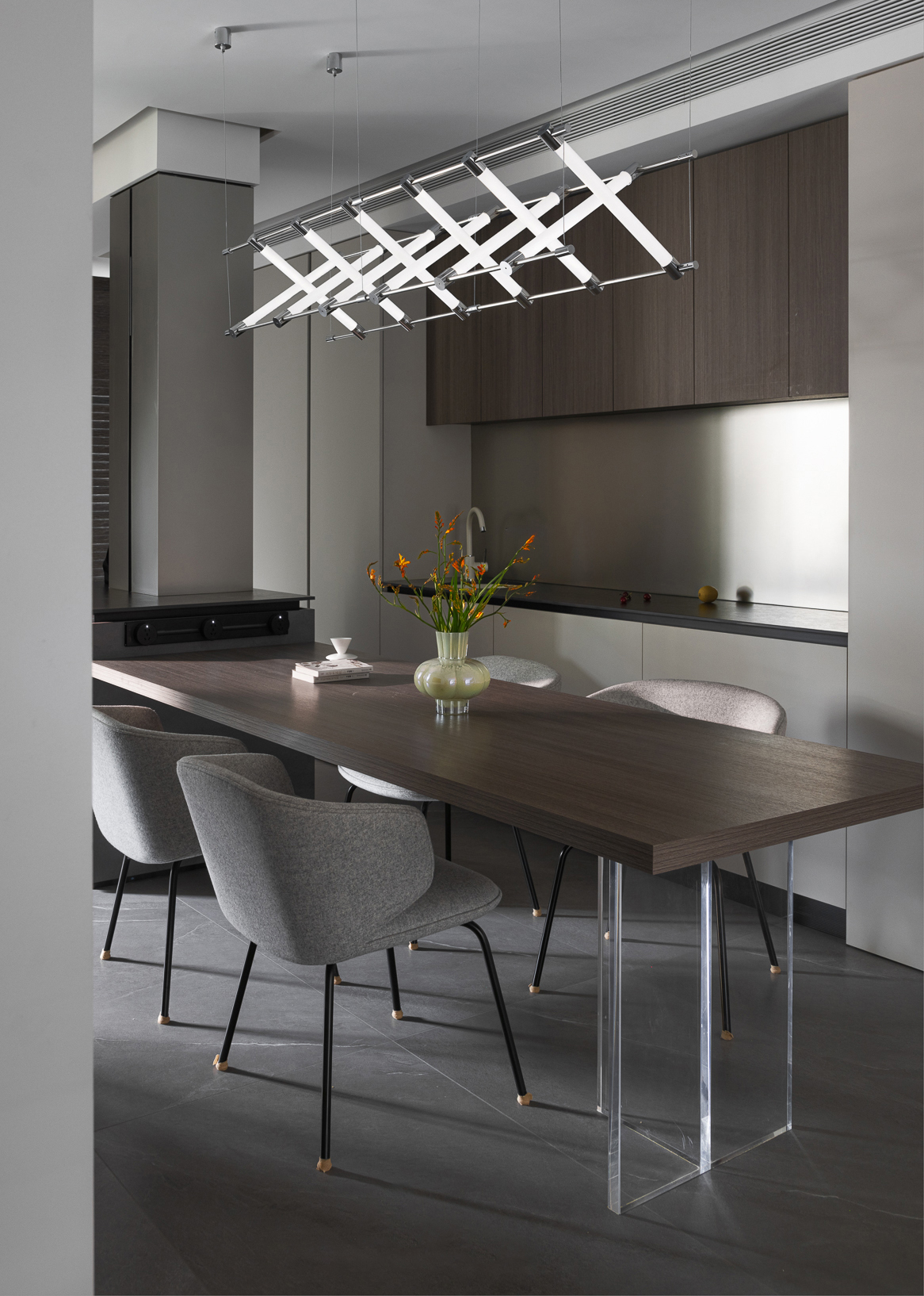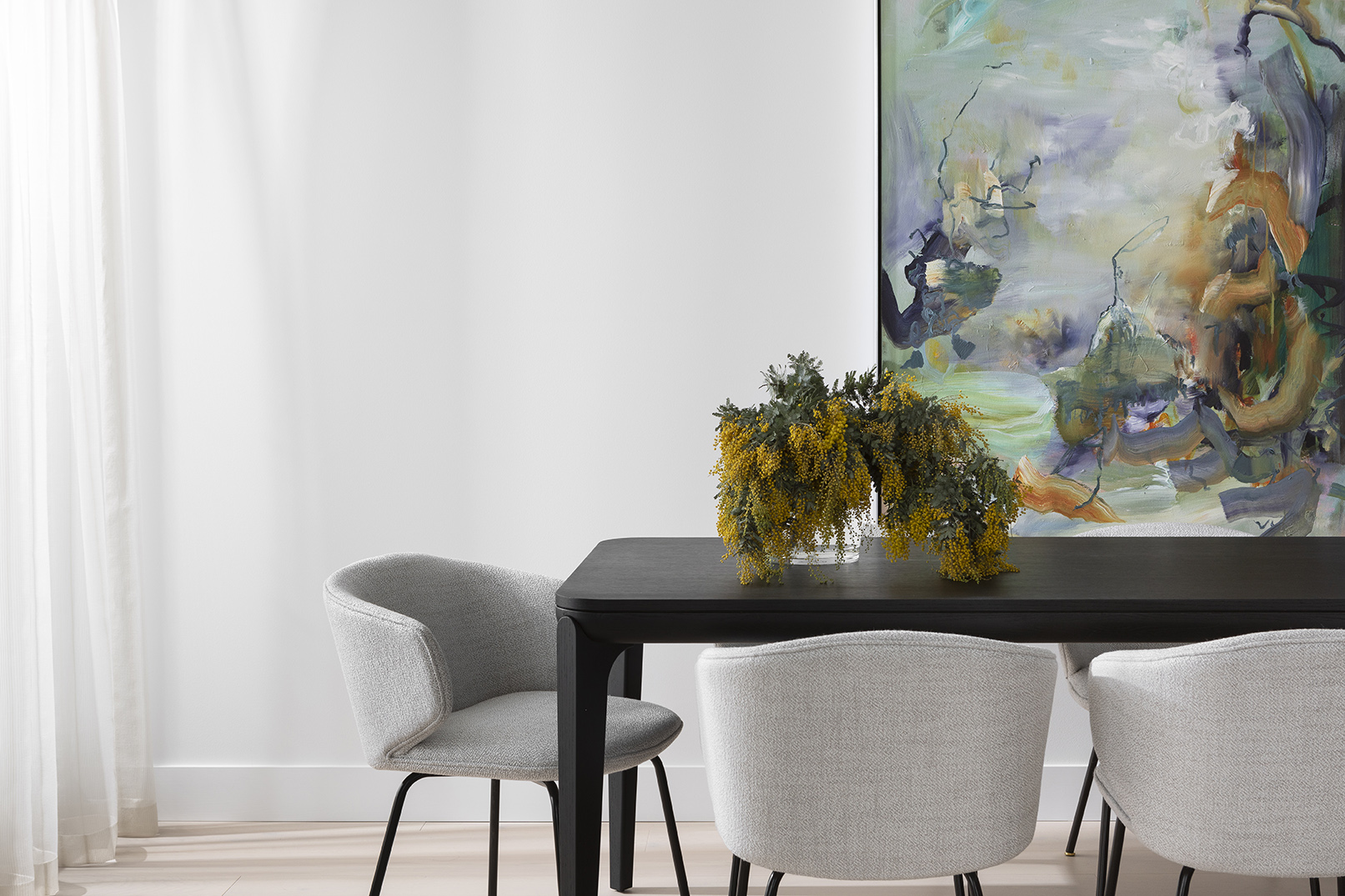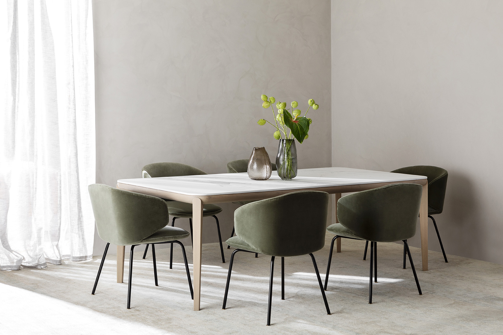 Sophisticated, straight metal legs and a "circle-in-square, square-in-circle" design gives BOLA dinning chair a fresh appearance. The back of the seat surrounds like an open wing, creating a comfortable space in the middle and a smiling curve. BOLA chair is the most elegant seat and appears exquisite when seen from any angle.