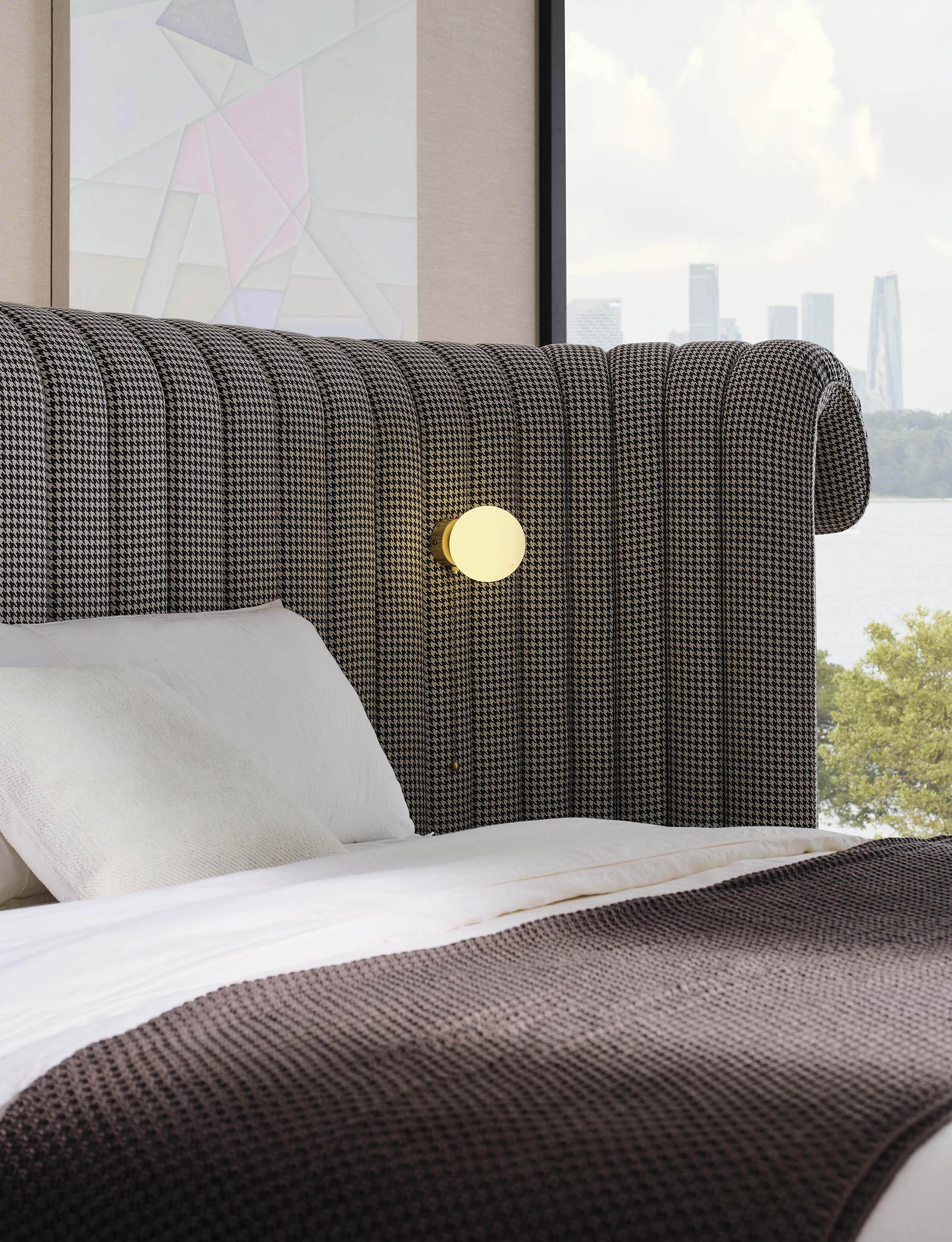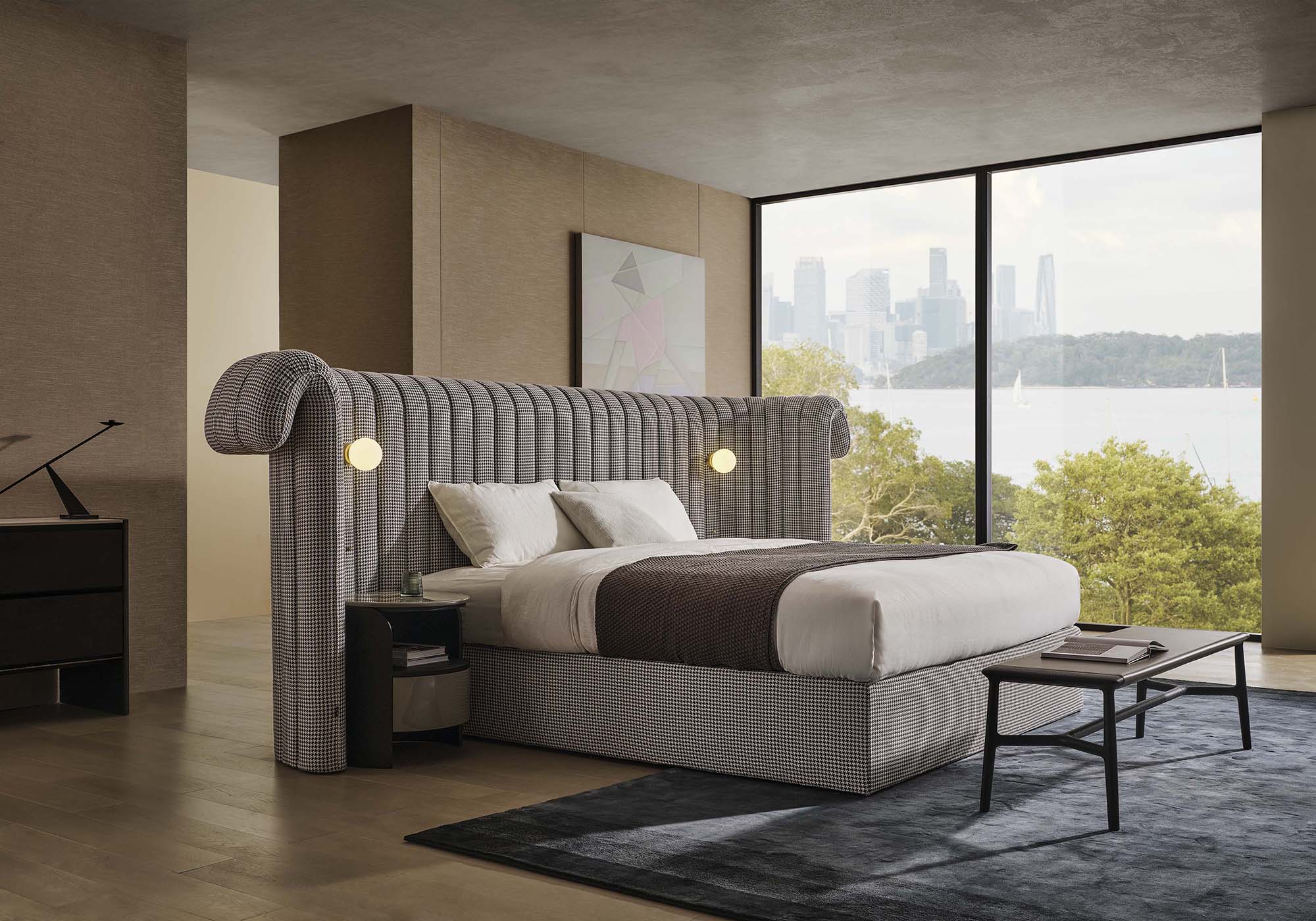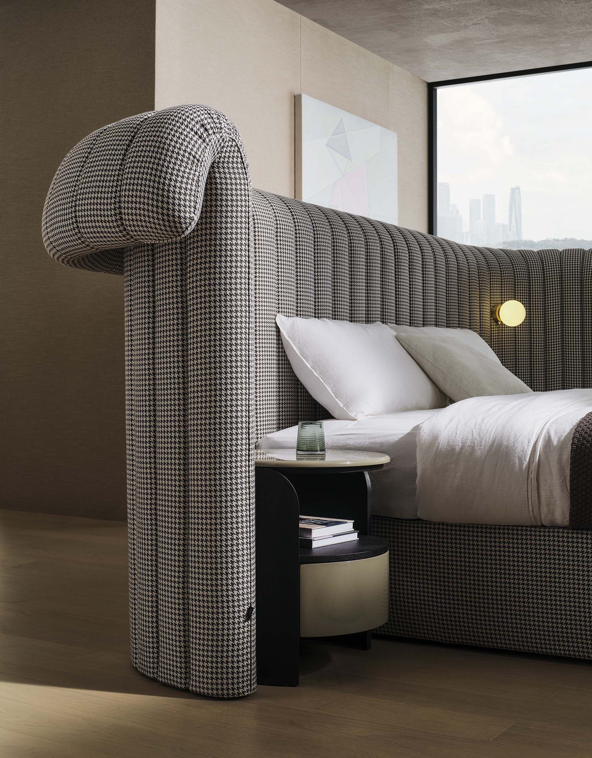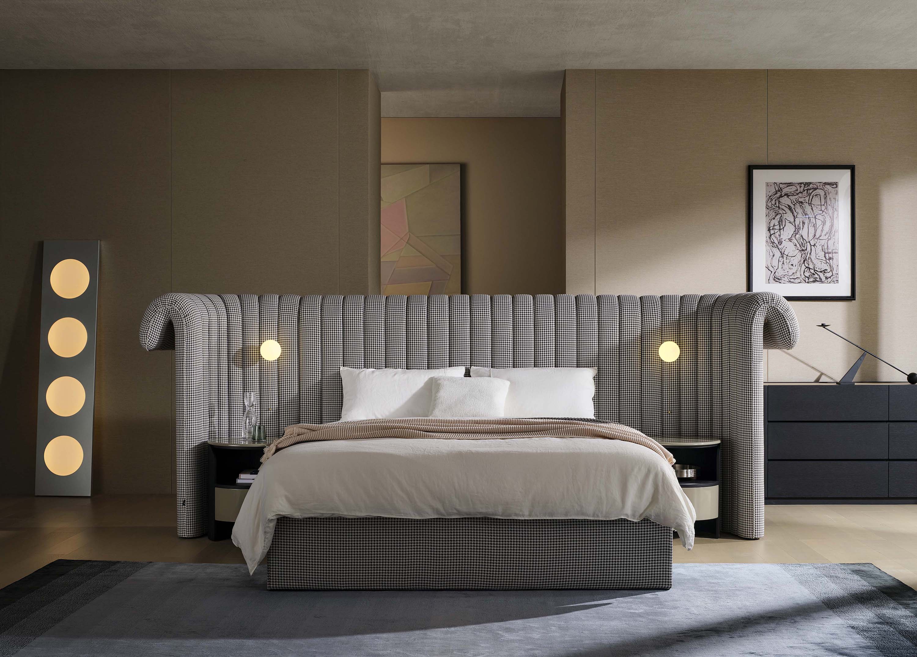 The Crown bed is a contemporary take on opulent high-end beds. Its lavish and fluid lines, exemplified by the extended headboard, invite a sense of indulgent comfort and an ambiance of serene seclusion. Enhanced with seamlessly integrated or suspended light fixtures, this bed epitomizes sophistication and relaxation, promising a luxurious retreat within the comforts of home.