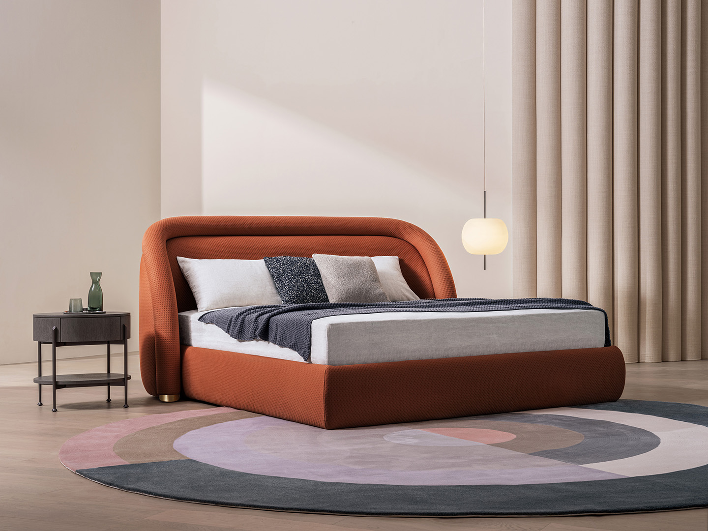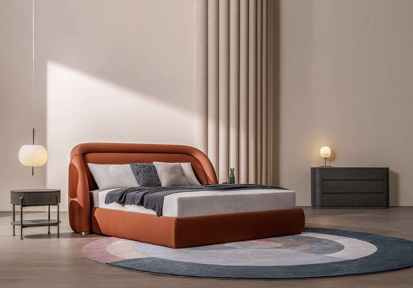 LOING bed inform by the exaggerated curve, sculptural form and sensual textual material. Together, it delivers a lay-back french lifestyle with its comfort, playful and elegant vibe.