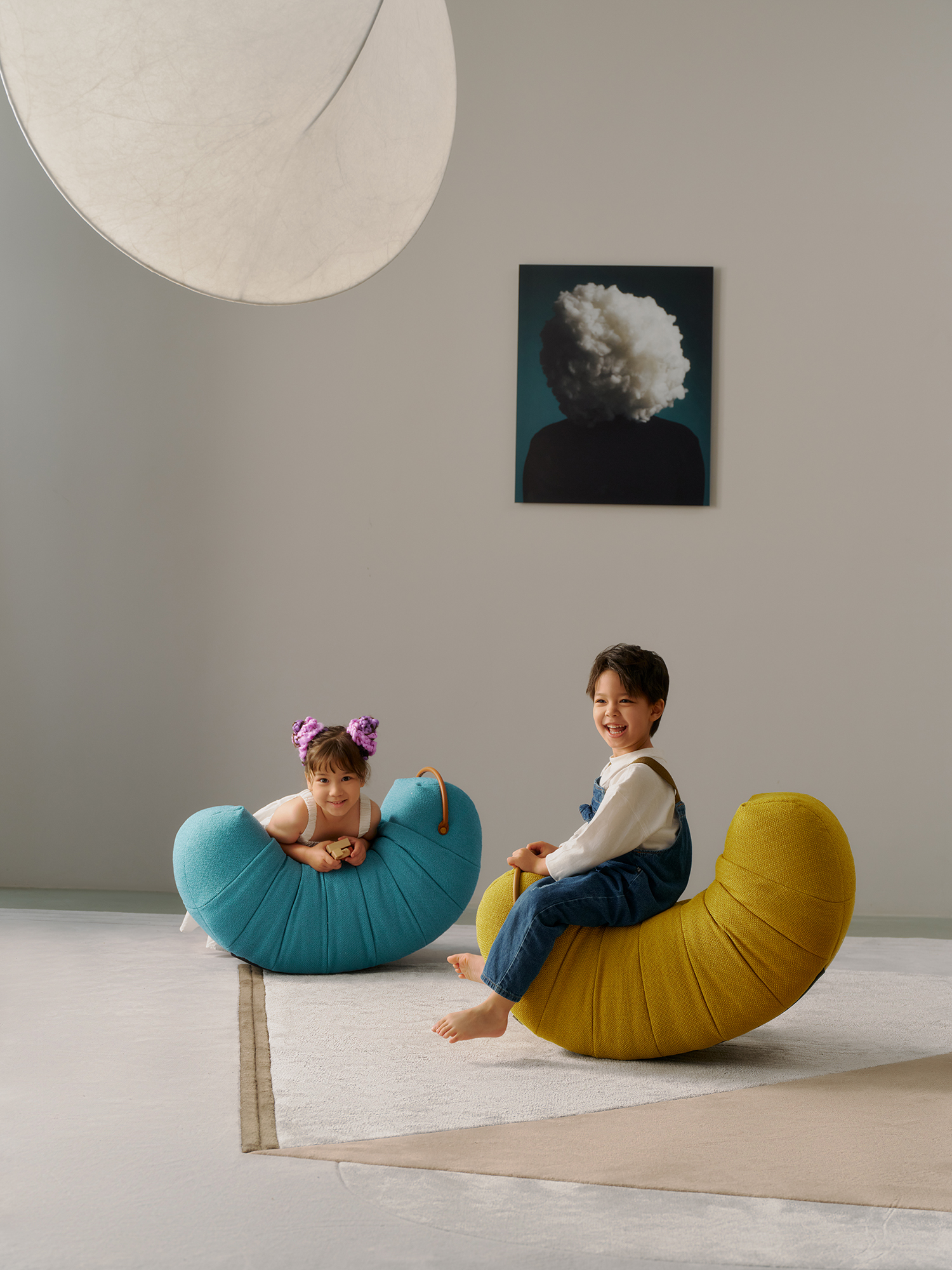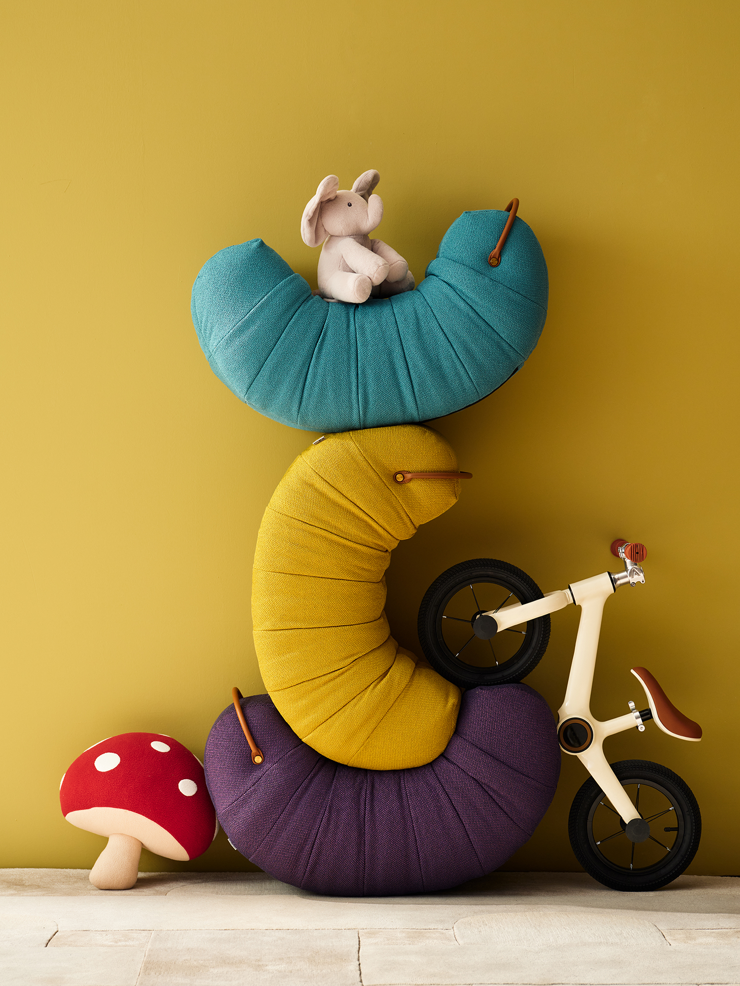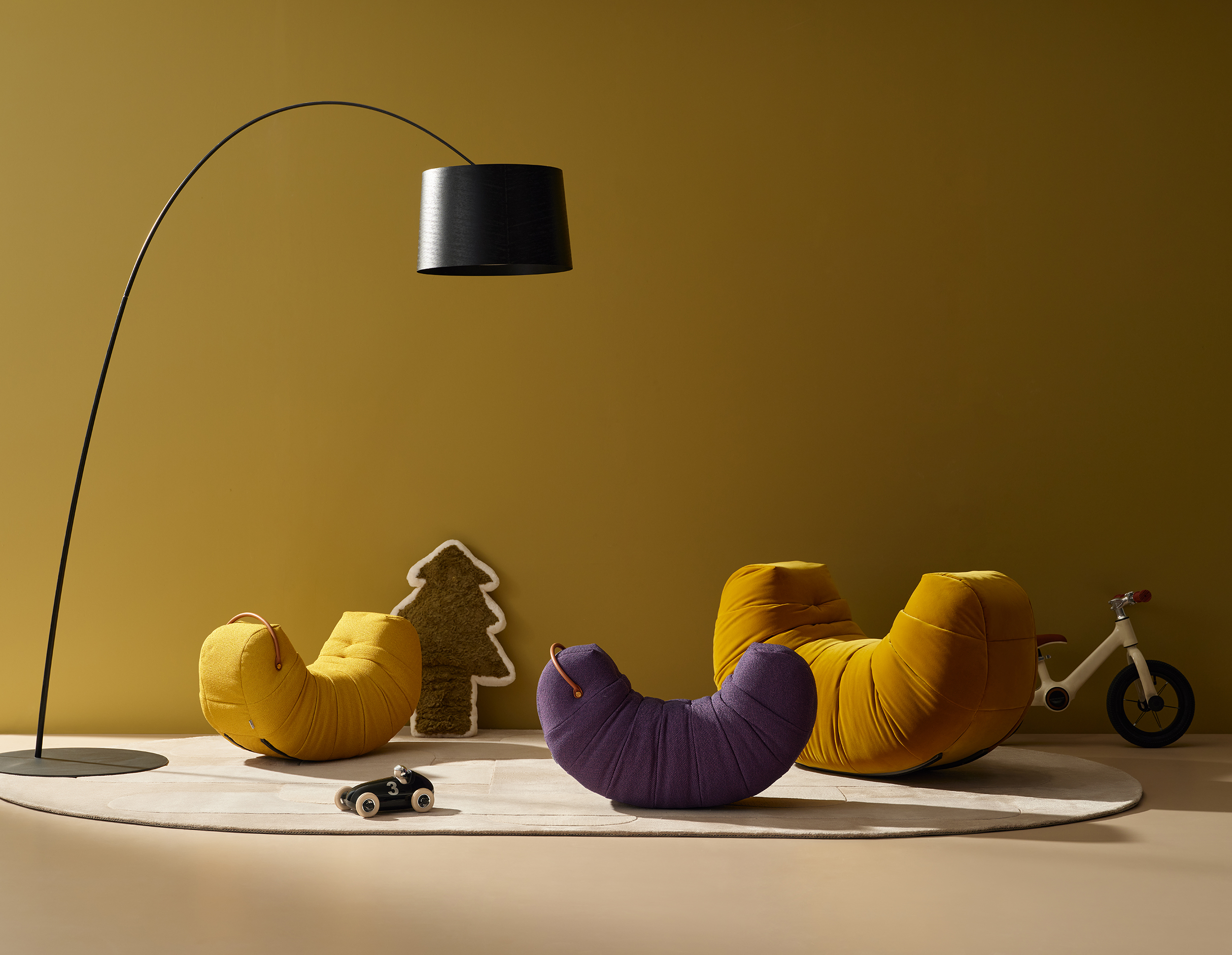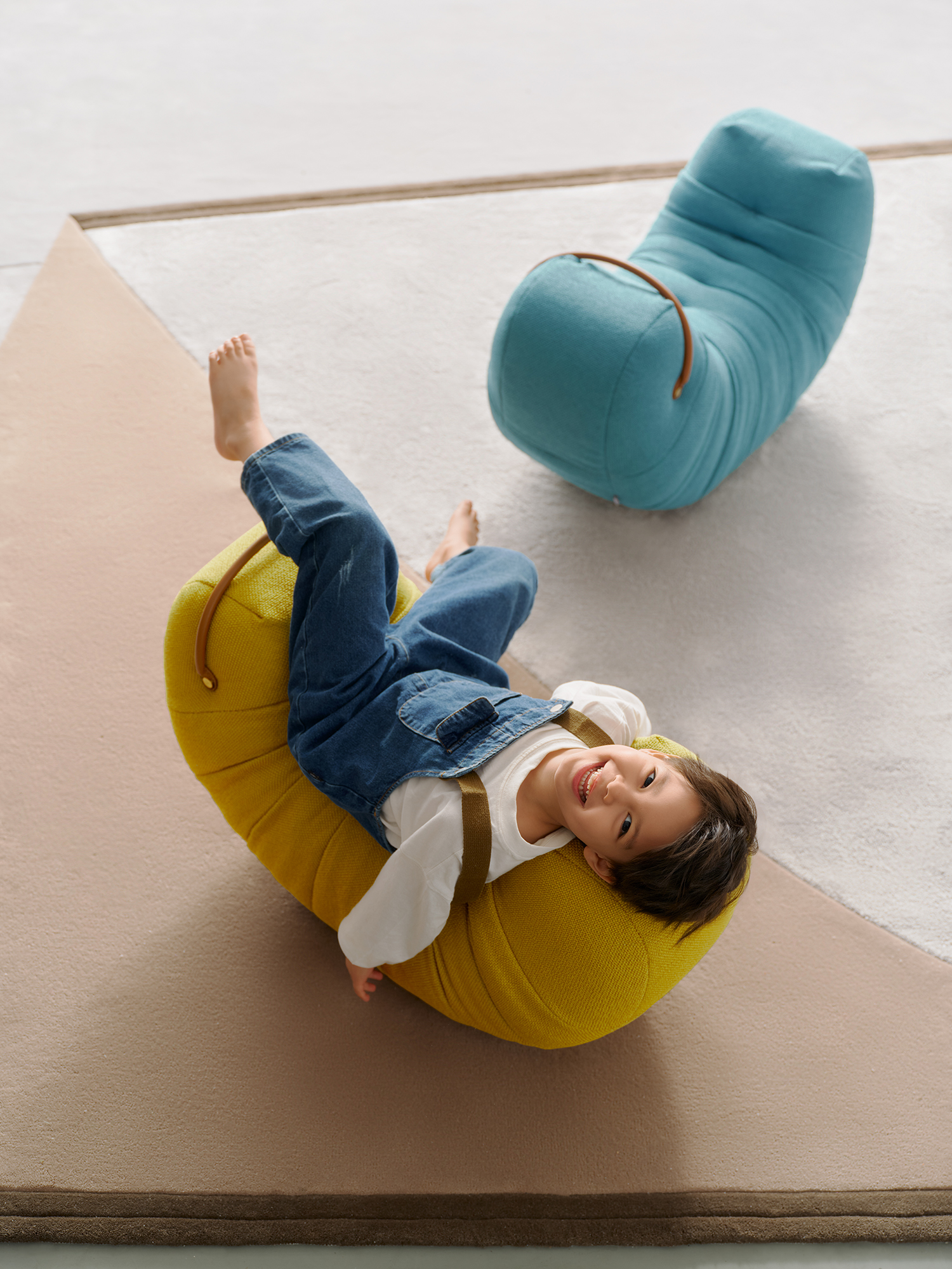 Upholstered with fabric. Metal feet in dark grey epoxy paint finish. The handle are in saddle leather.
