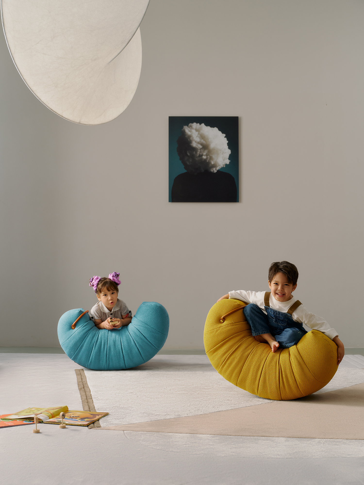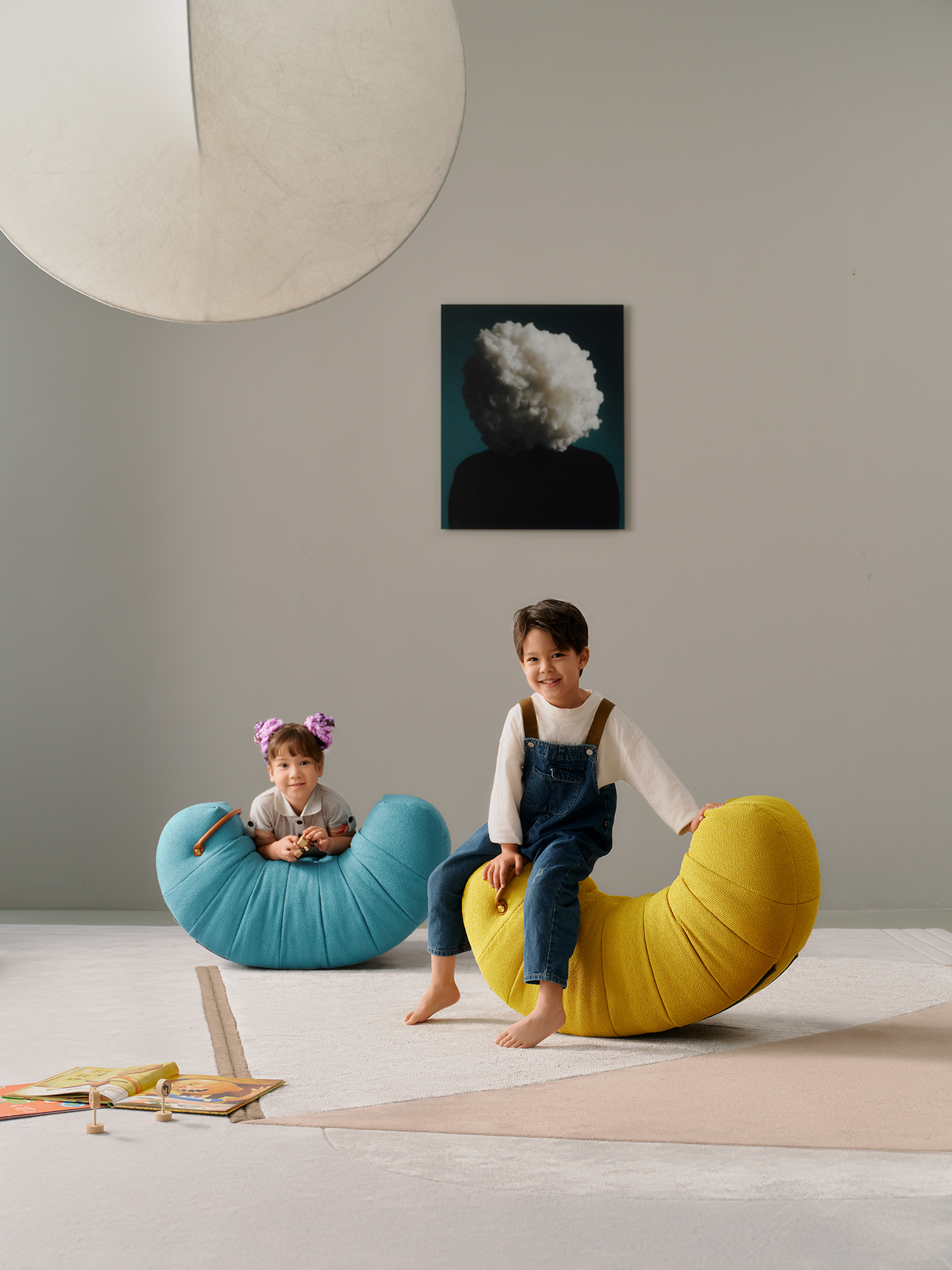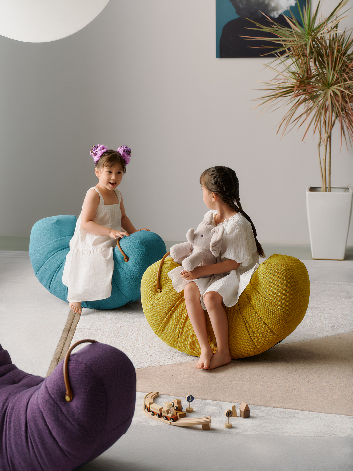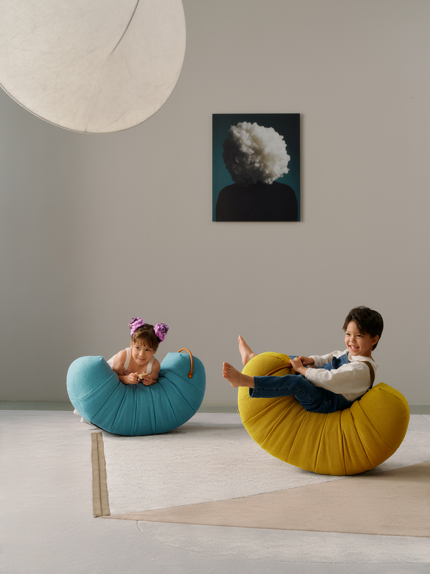 Upholstered with fabric. Metal feet in dark grey epoxy paint finish. The handle are in saddle leather.