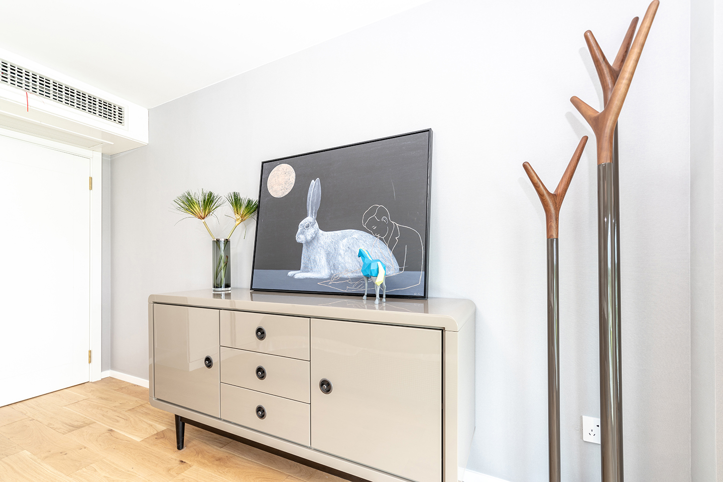 Credenza made in wood with drawer cabinet in colored lacquer finish.