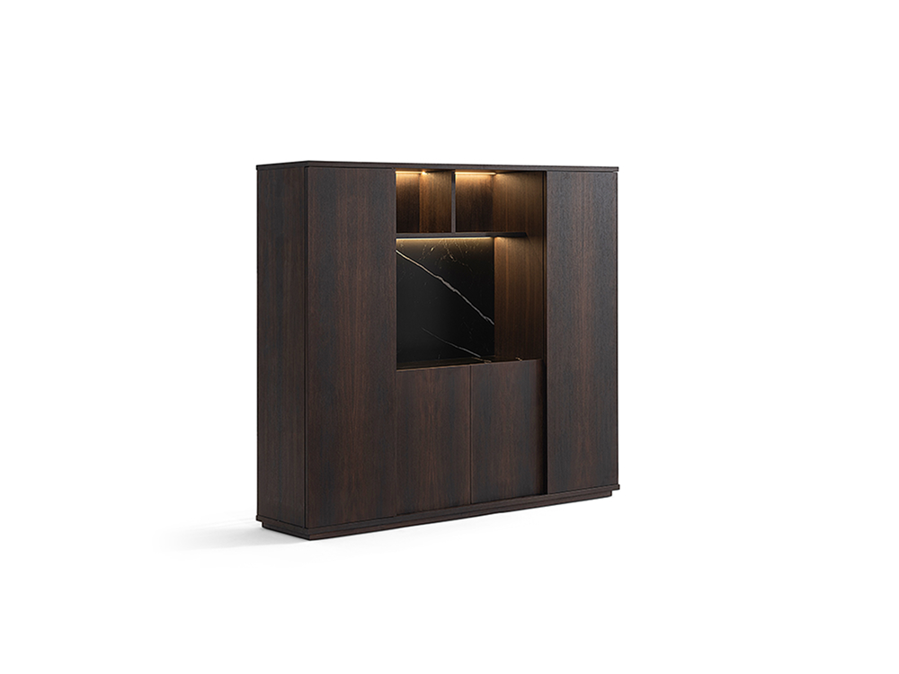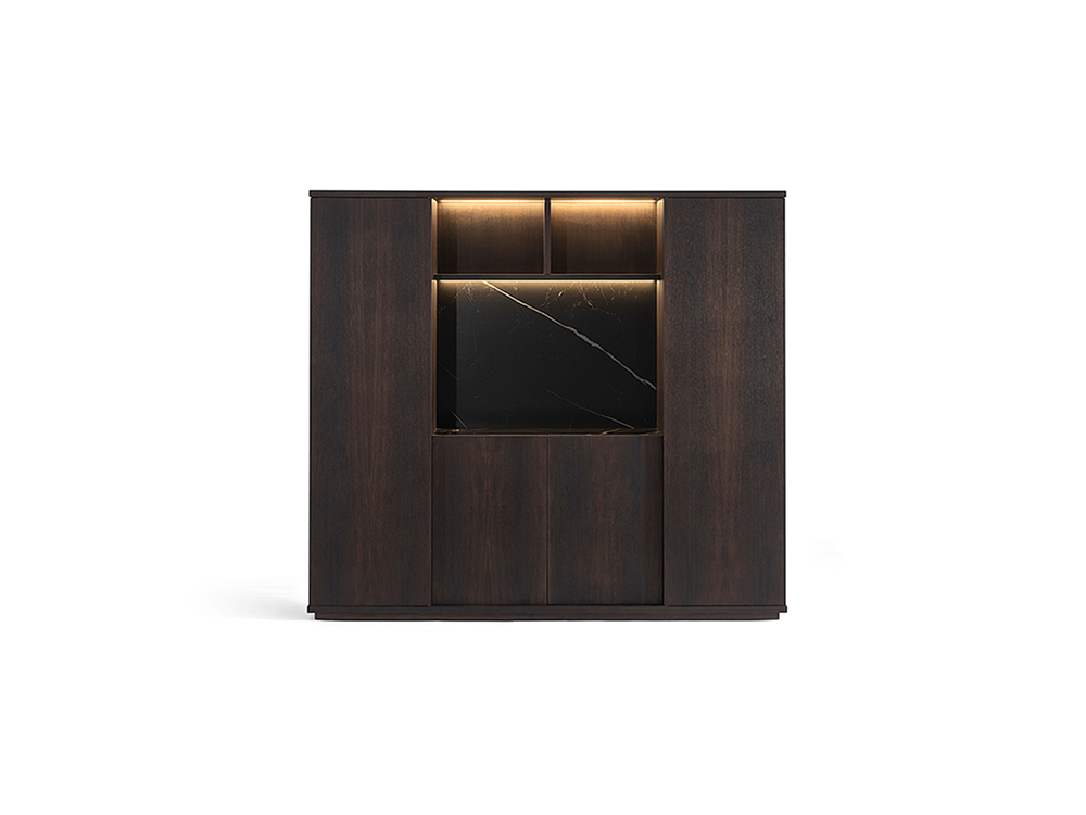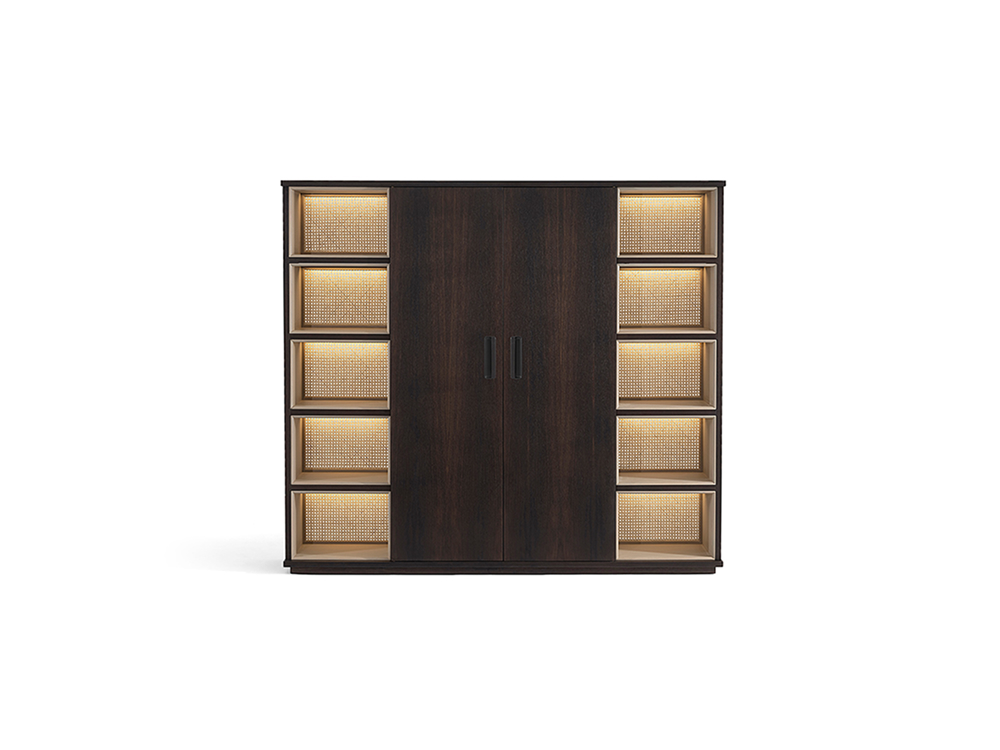 Cabinet is made of wood, includes two 180-degree double swing doors. The back panel and top surface of the middle section are made of sintered stone. The two-tone storage cubicles are made of wood in white oak finish, hand-woven caned on the back. LED lights are included.