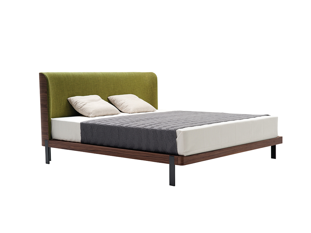 Headboard upholstered with fabric or leather. Outside the headboard and bottom frame in wood. Feet in dark grey epoxy paint finish.