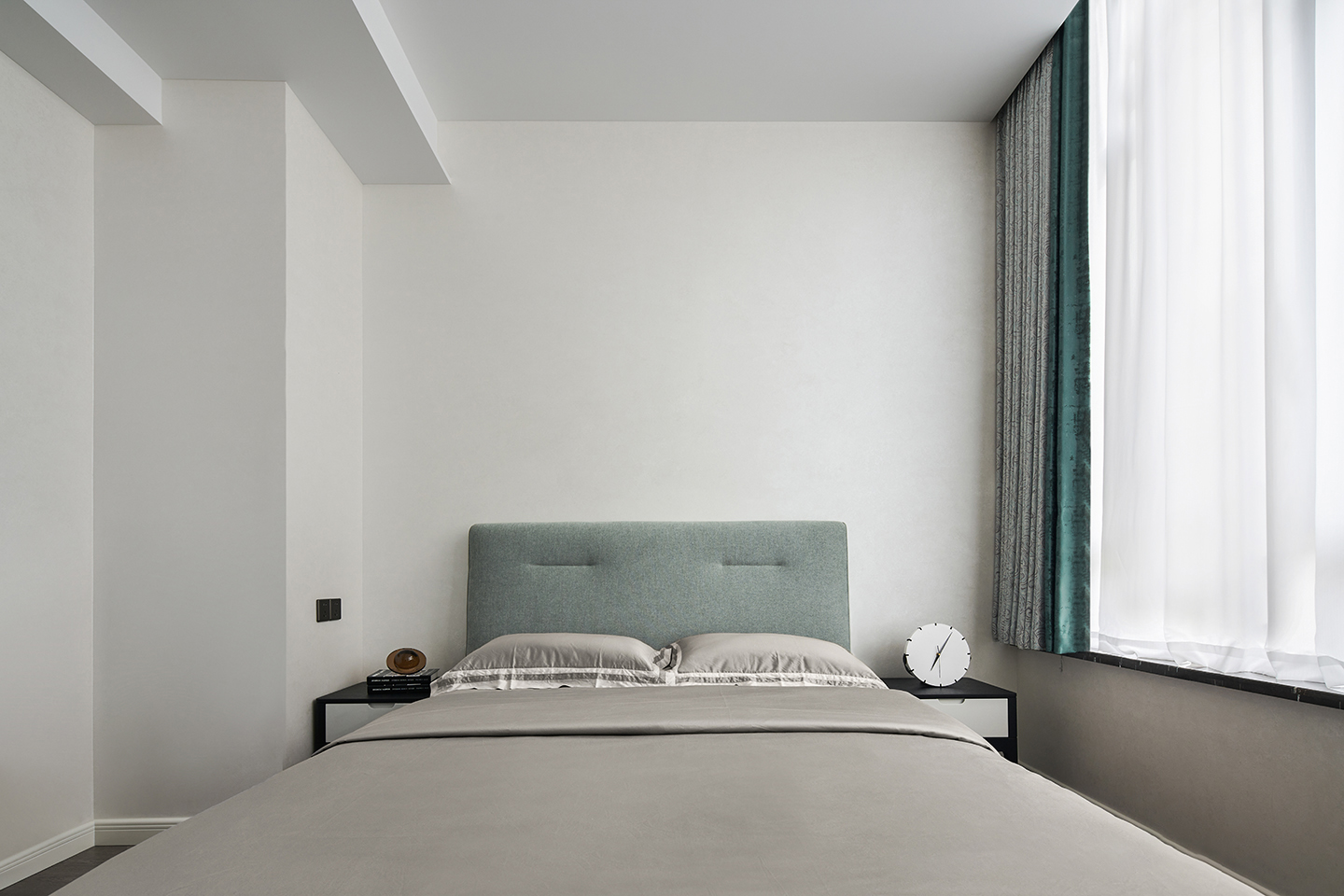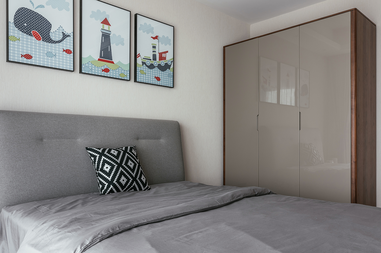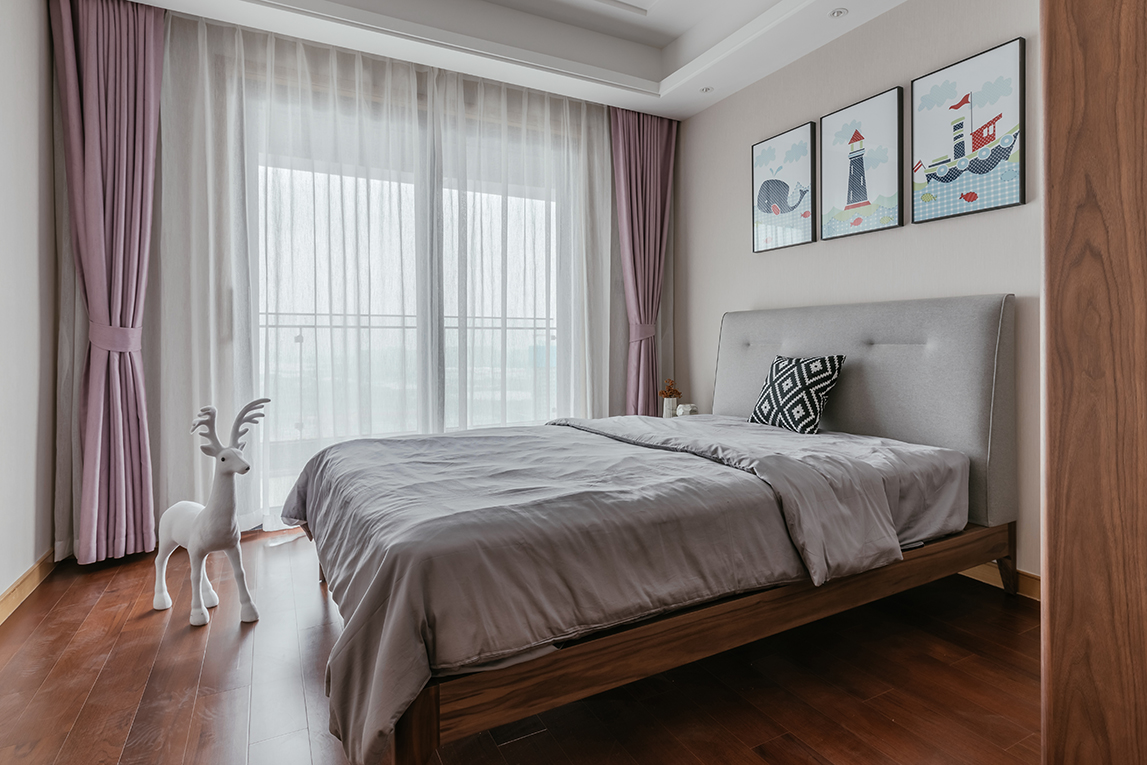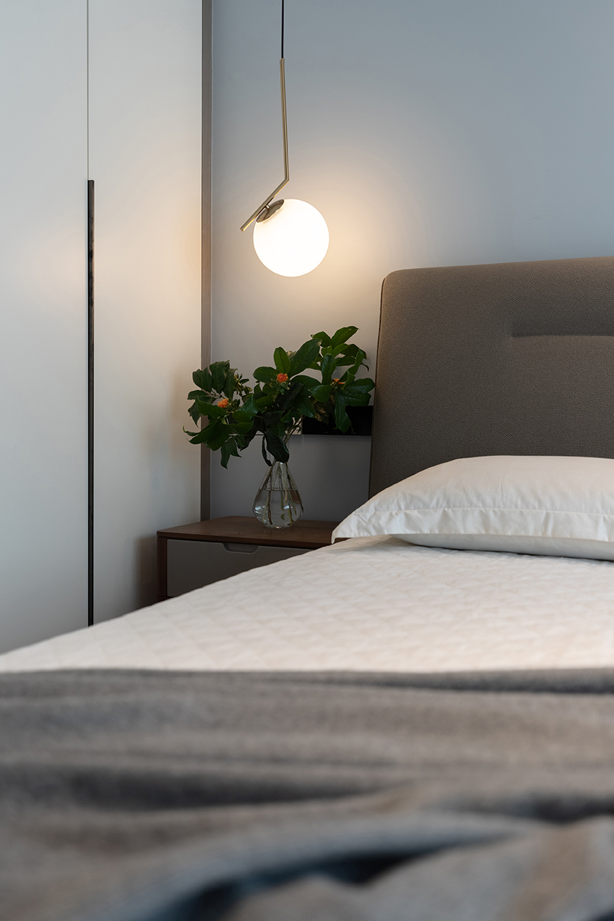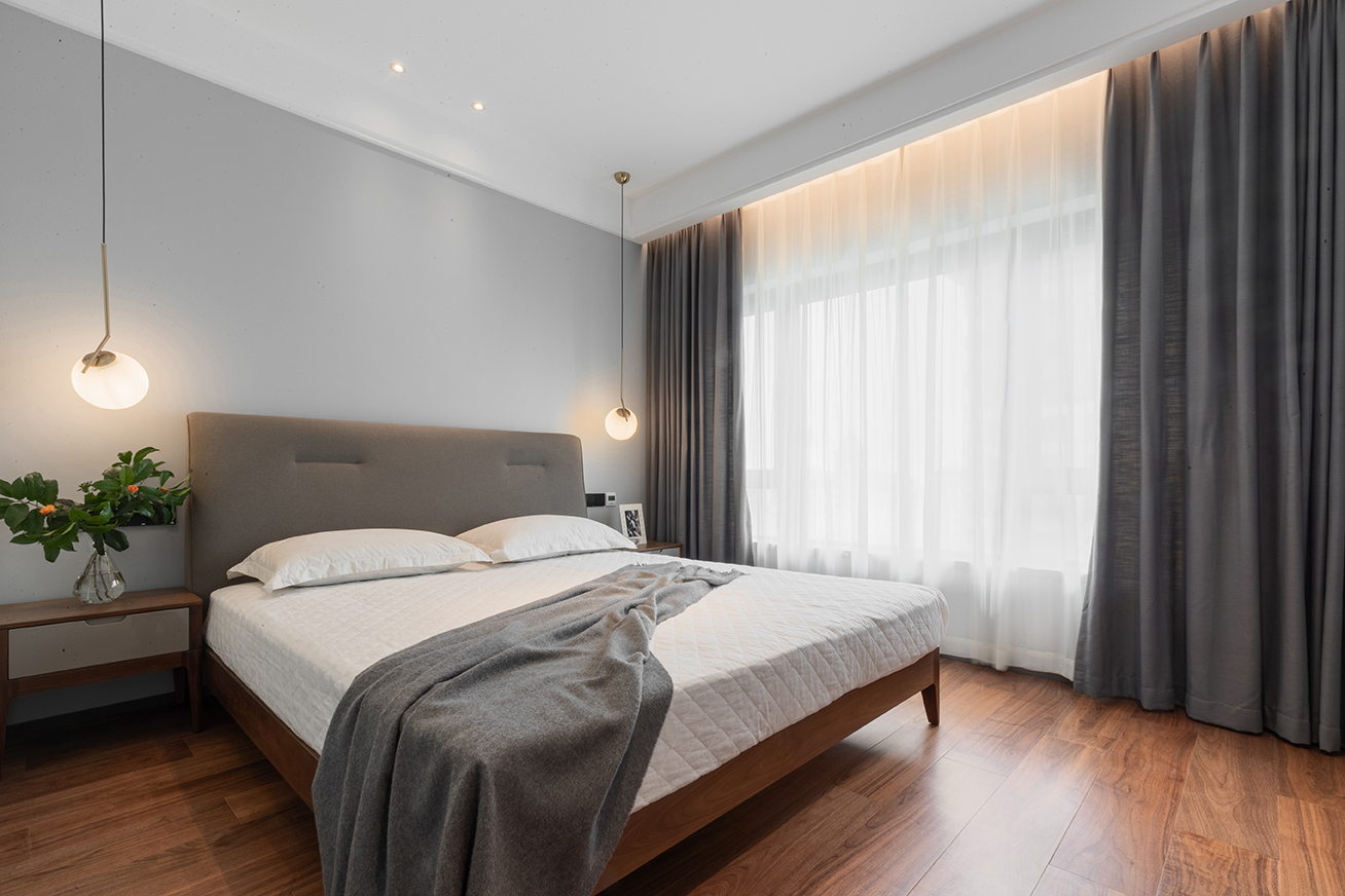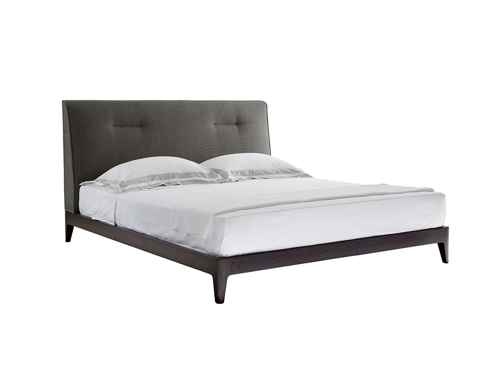 This inviting bed features a clean headboard, the lines of which are highlighted by subtle piping. The frame is offered in oak or walnut, and a wide range of fabrics allows it to blend well in all types of interiors.