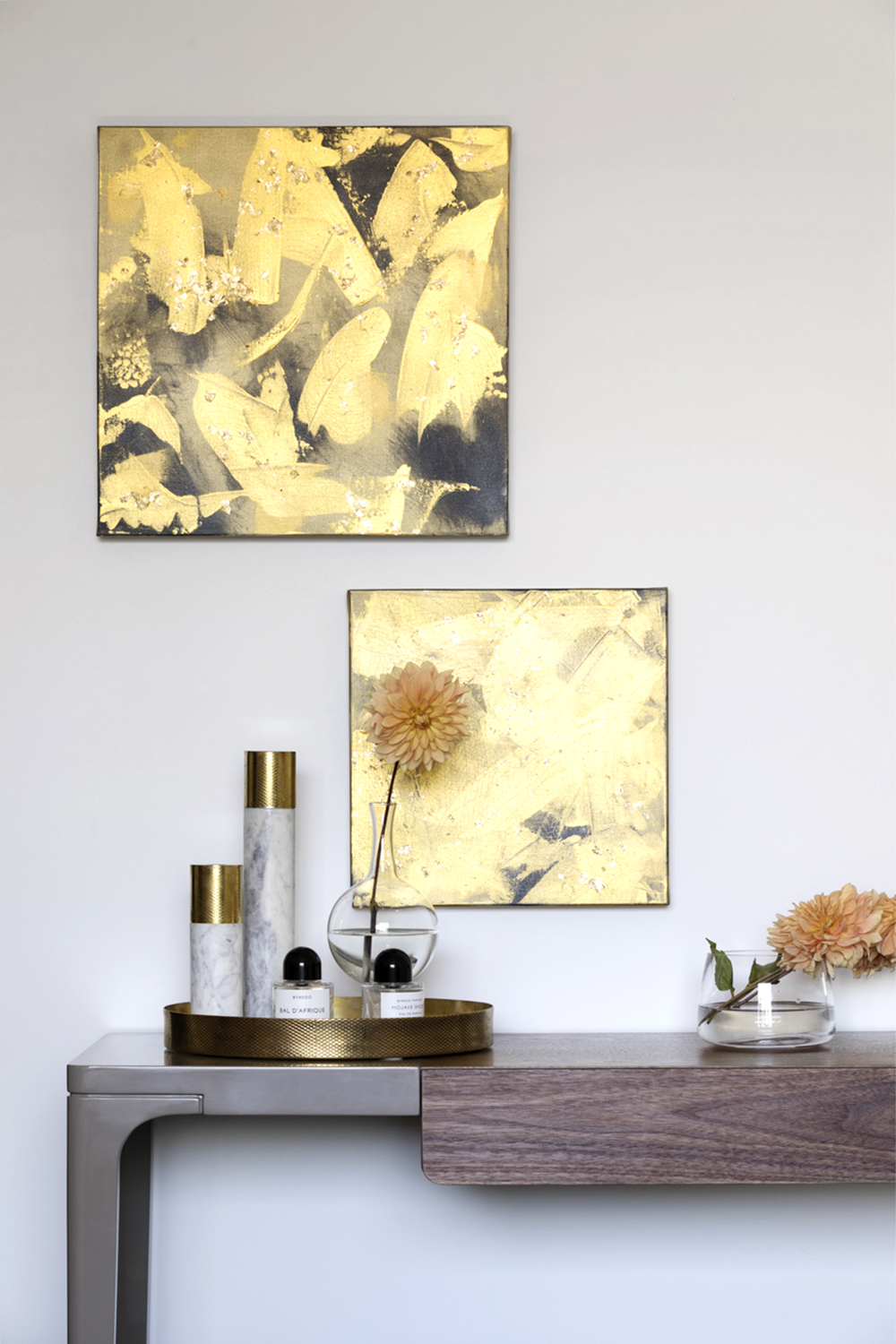 Desk made in wood with colored lacquer finish on the 1/3 of the left hand side.