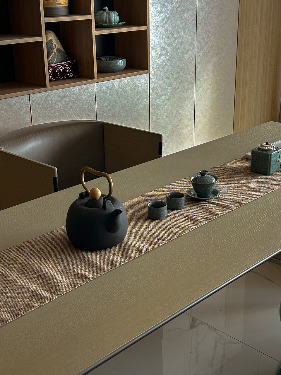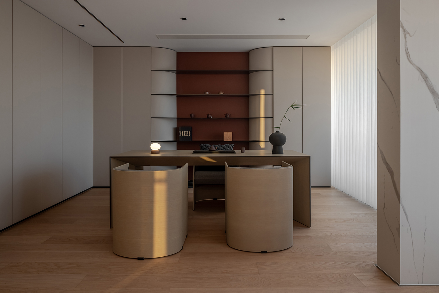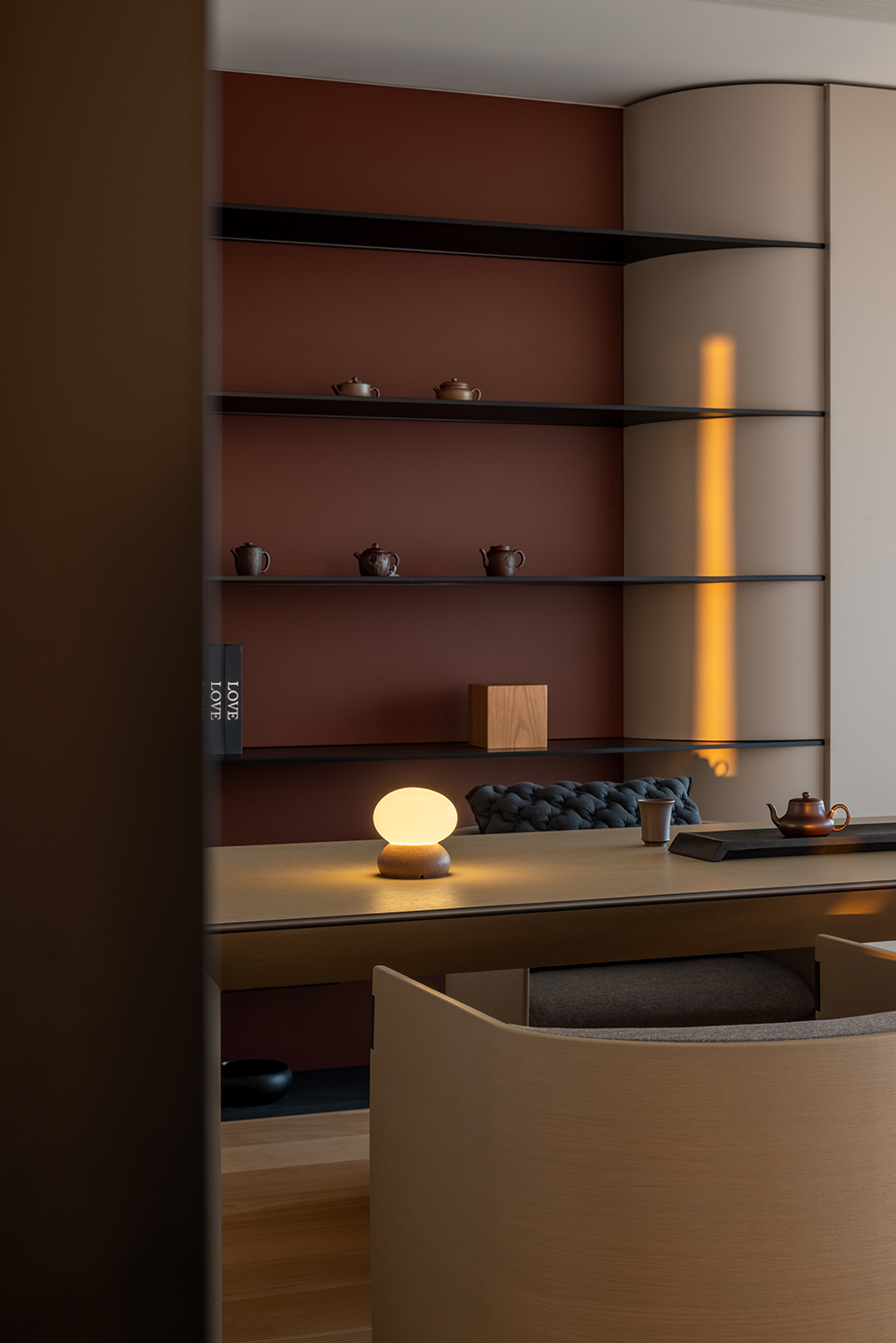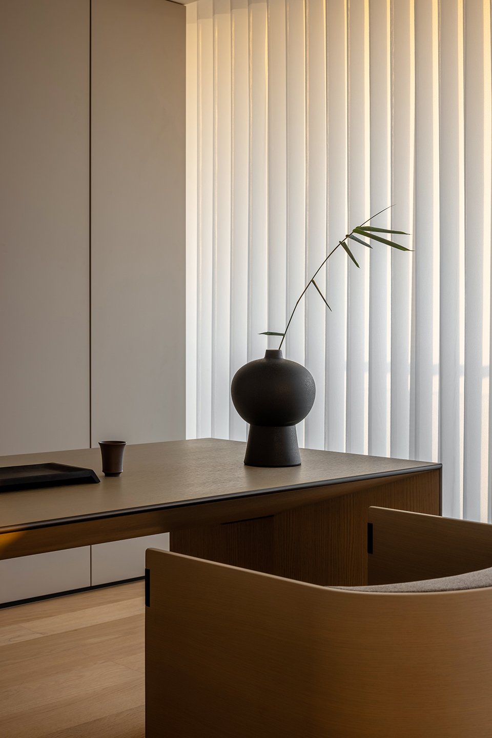 This comfortable chair is named WATER as it recalls the gentle smoothness of water. The master and the guest chair present slightly different appearances, not only to signify the status of their users but also to harmoniously pair with the WIND tea table. The “floating” seat, armrest protection and bended wooden back structure highlight the extreme attention to refined craftsmanship, an essential element of Asian design.