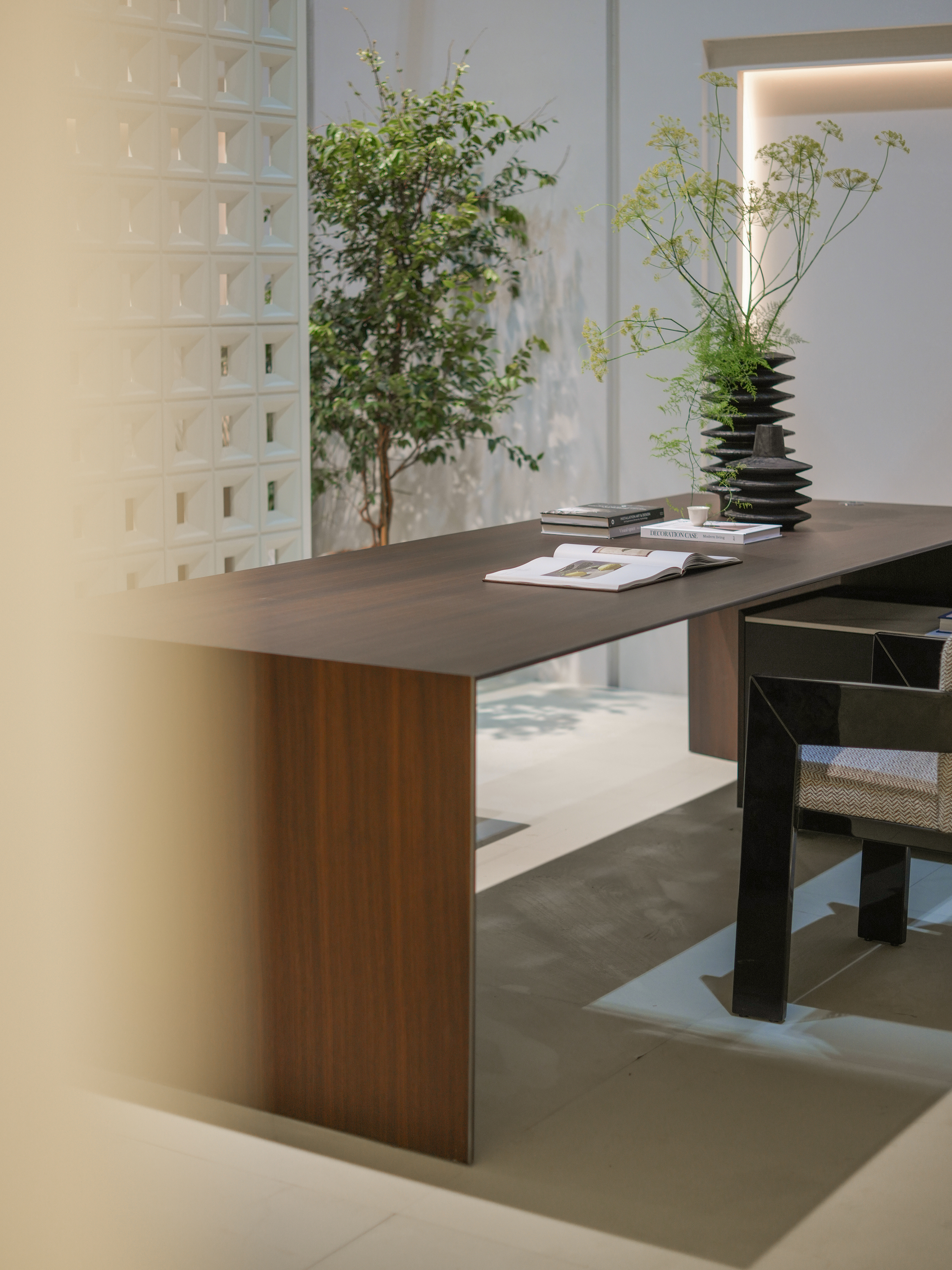 Introducing the WIND working table. By enhancing its proportions and details, we have preserved the Zen aesthetic while embracing a sleek, modern style, especially with the table legs featuring a refined 45° diagonal cut on the inner sides. Pair the WIND working table with our matching low cabinets to meet the storage needs for the office, and enjoy the design and function for your workspace.