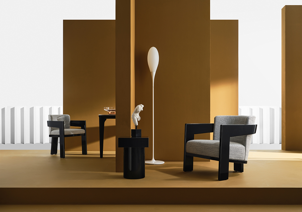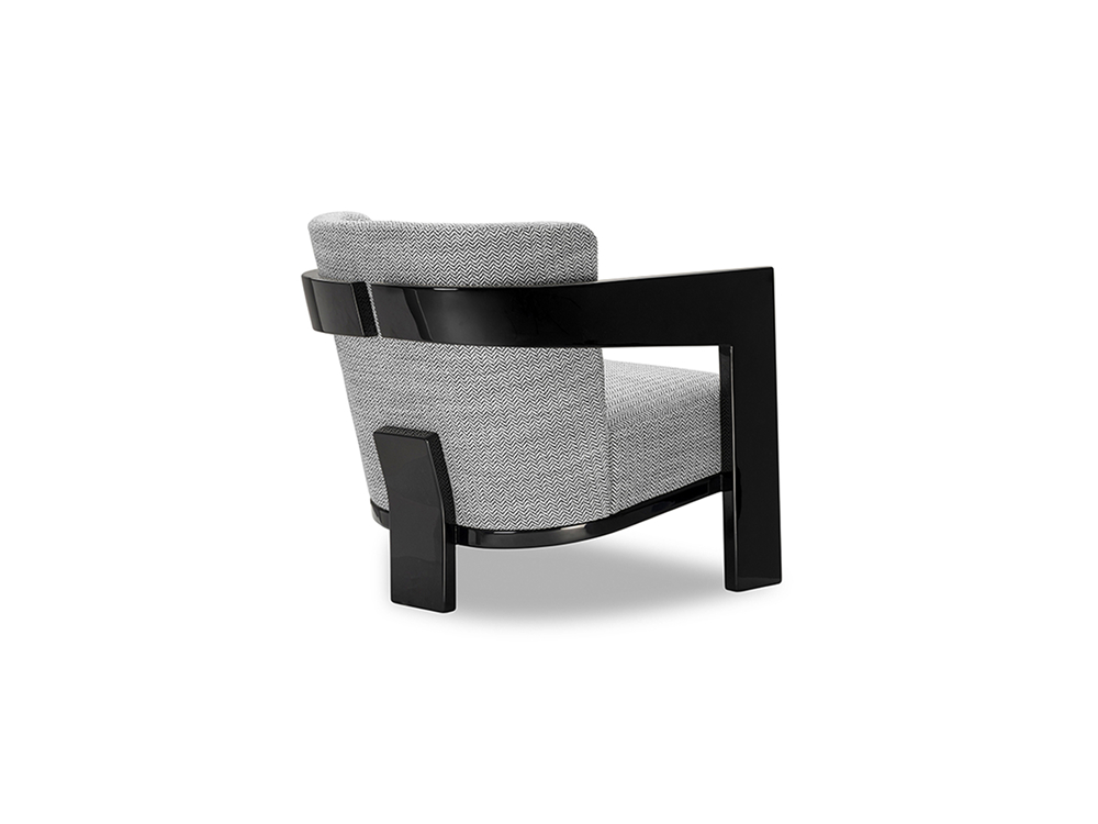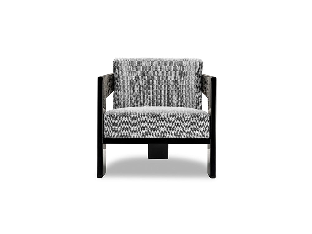 The armchair is upholstered in fabric or leather. Arms, legs and frames are made of wood, aviliable in black lacquer finish or wood finish.