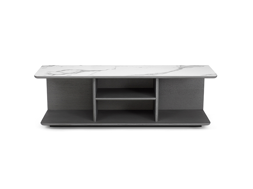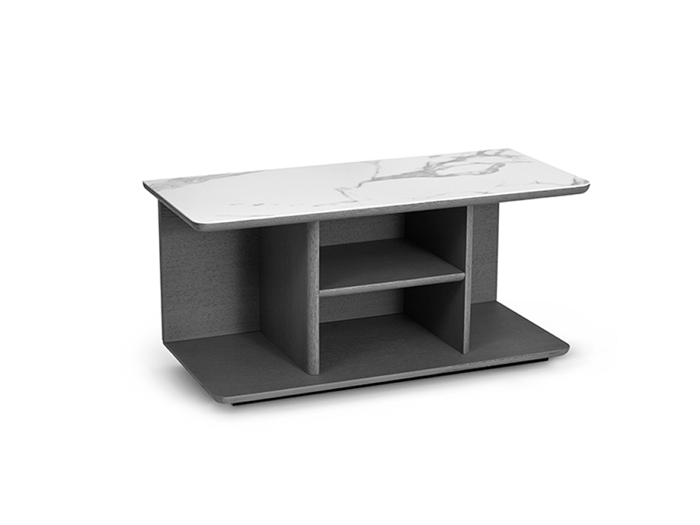 Made in wood with table top in sintered stone. Metal base in dark grey epoxy paint finish.