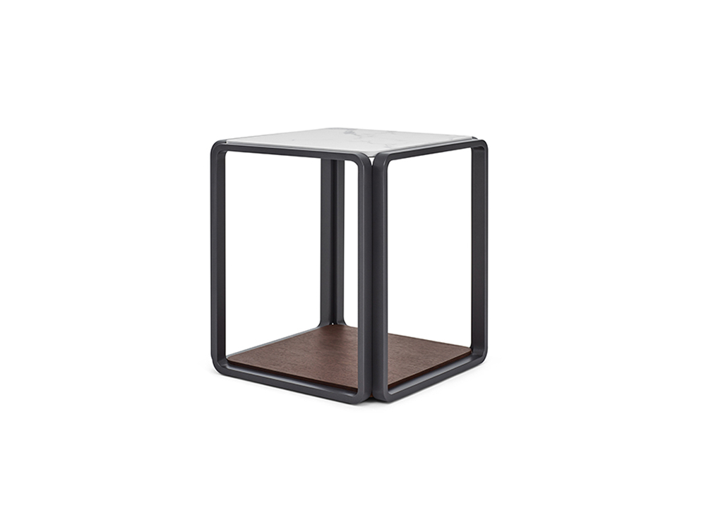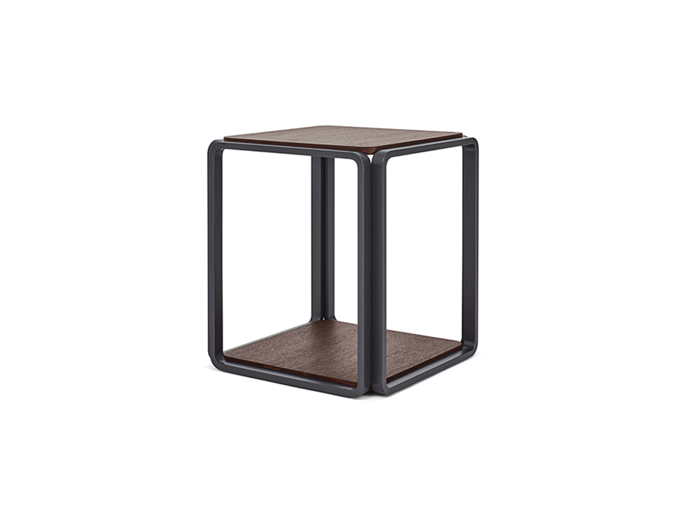 Table top in wood or sintered stone, bottom panel in wood only. Metal frame in dark grey epoxy paint finish.