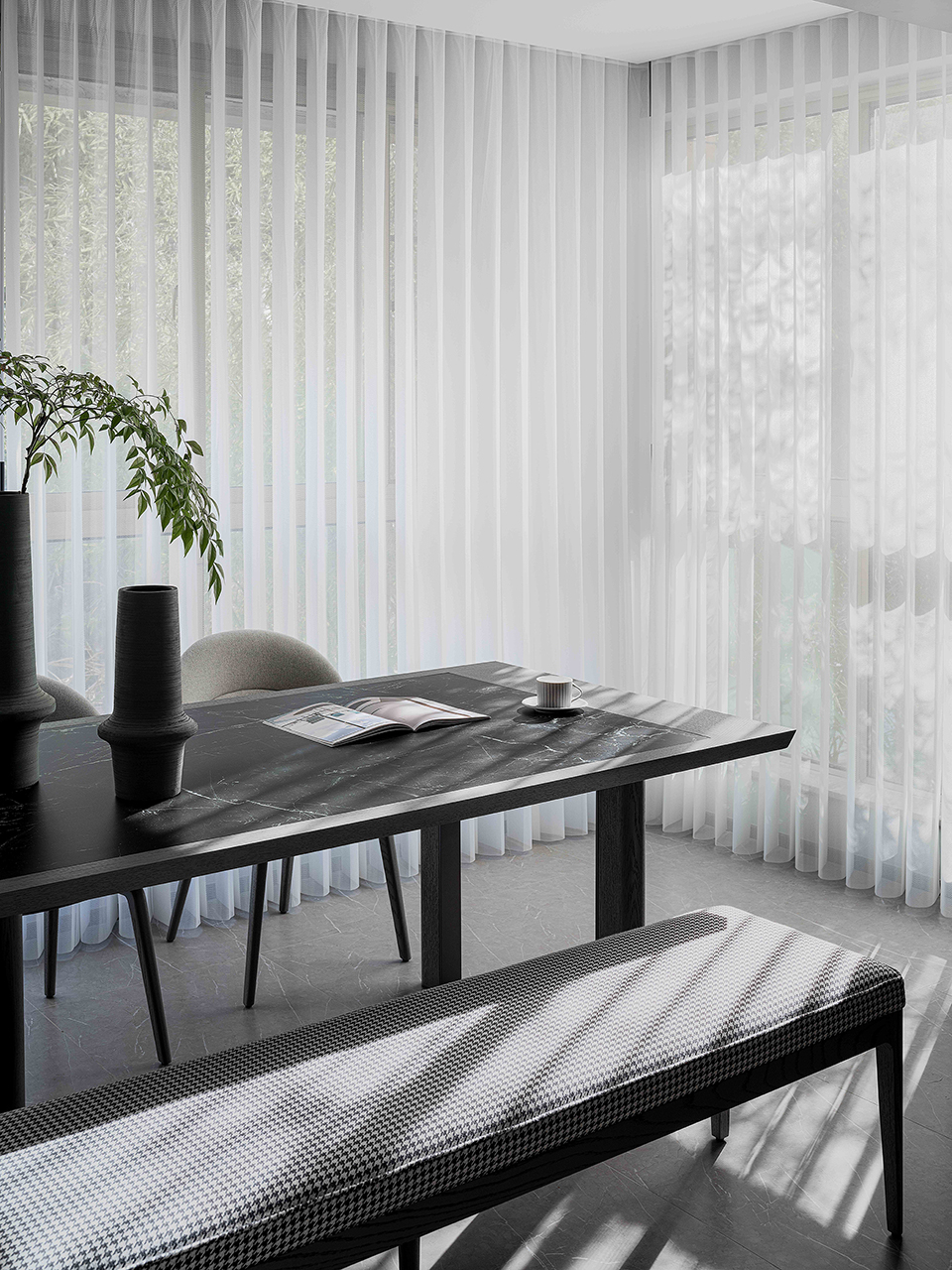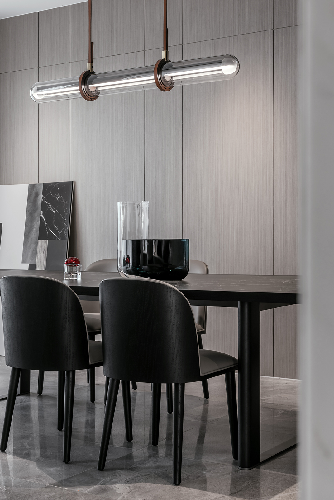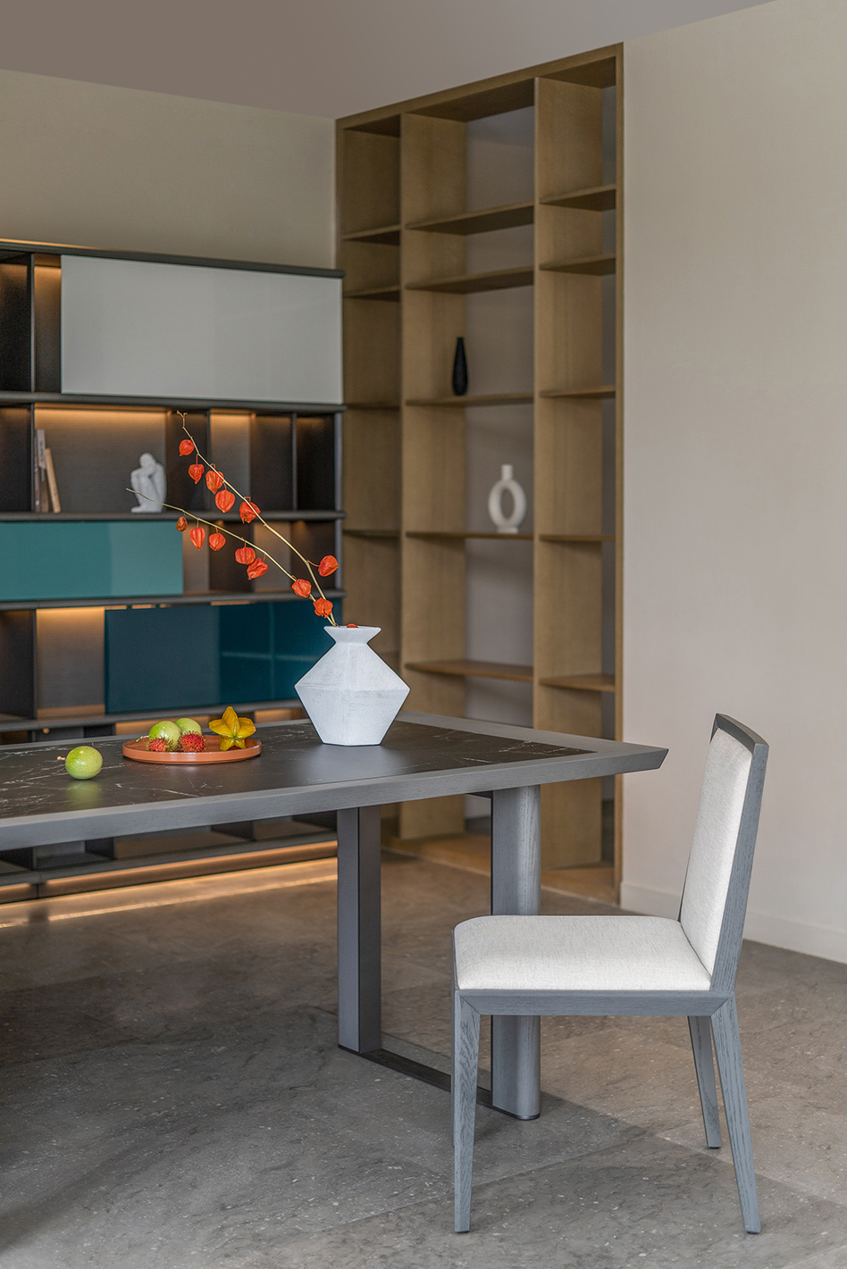Stone slab is imbedded in the wooden top of PLEGAT dining table. Composite wooden columns stand on paralleled metal frames, showing elegance and contrast between different materials. It is a classic work of craftsmanship and details.