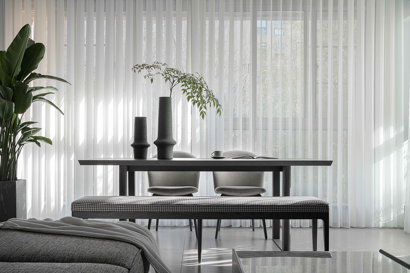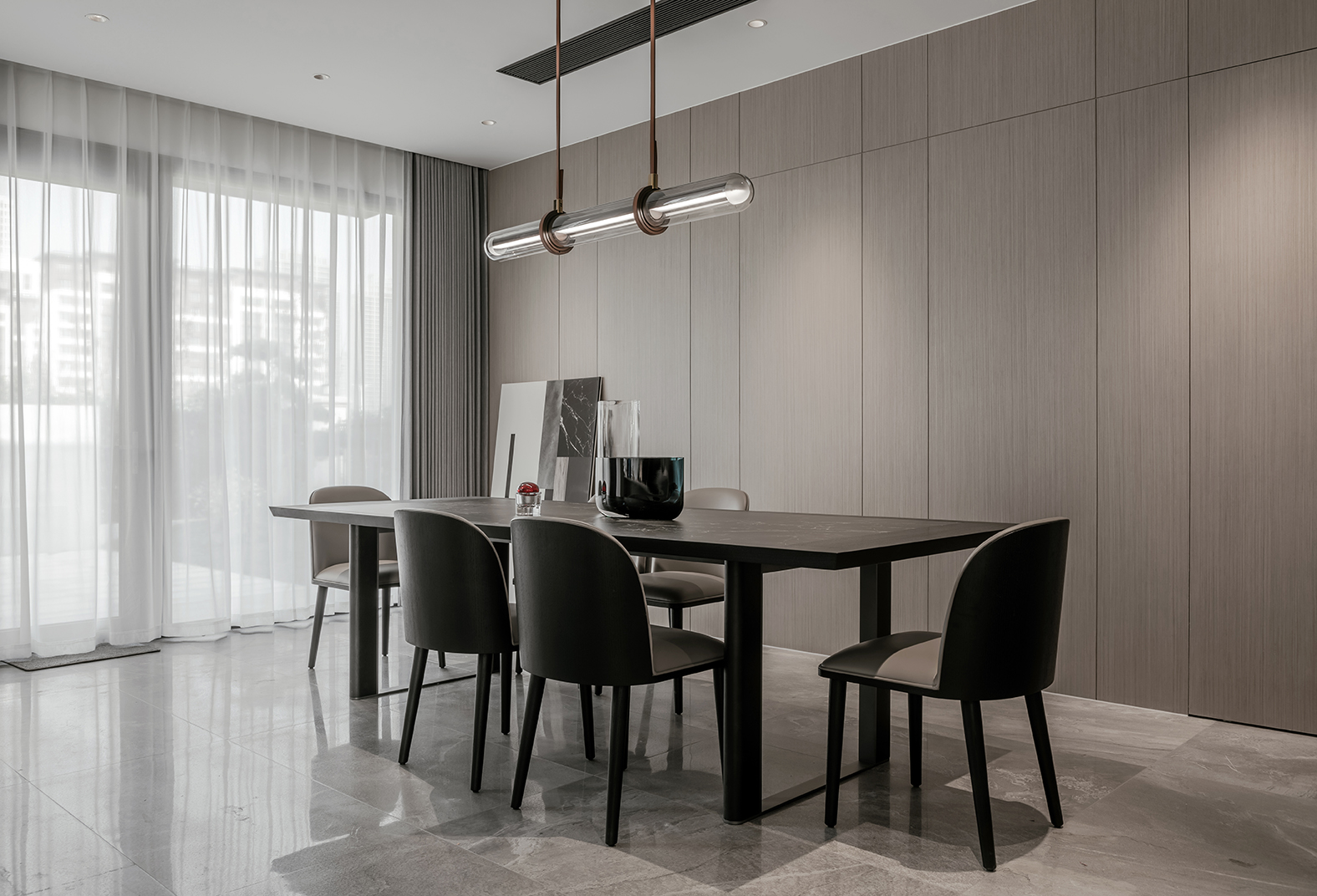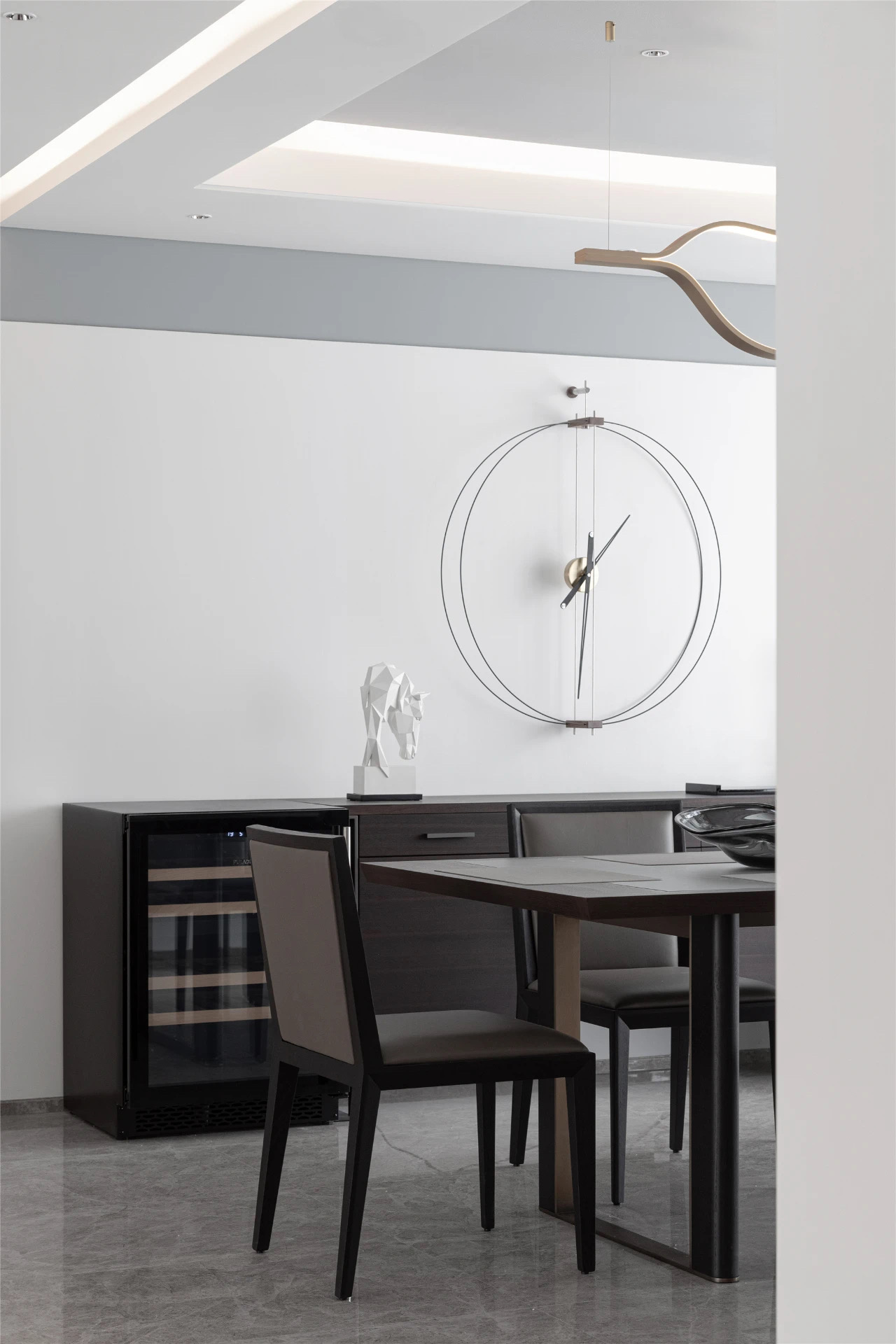 Stone slab is imbedded in the wooden top of PLEGAT dining table. Composite wooden columns stand on paralleled metal frames, showing elegance and contrast between different materials. It is a classic work of craftsmanship and details.
