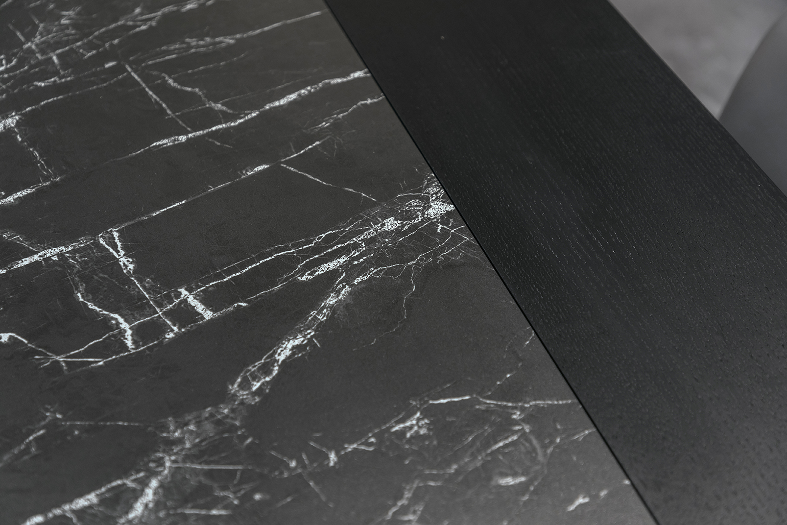 Dining table made in wood with sintered stone insert on the table top. Legs in metal.