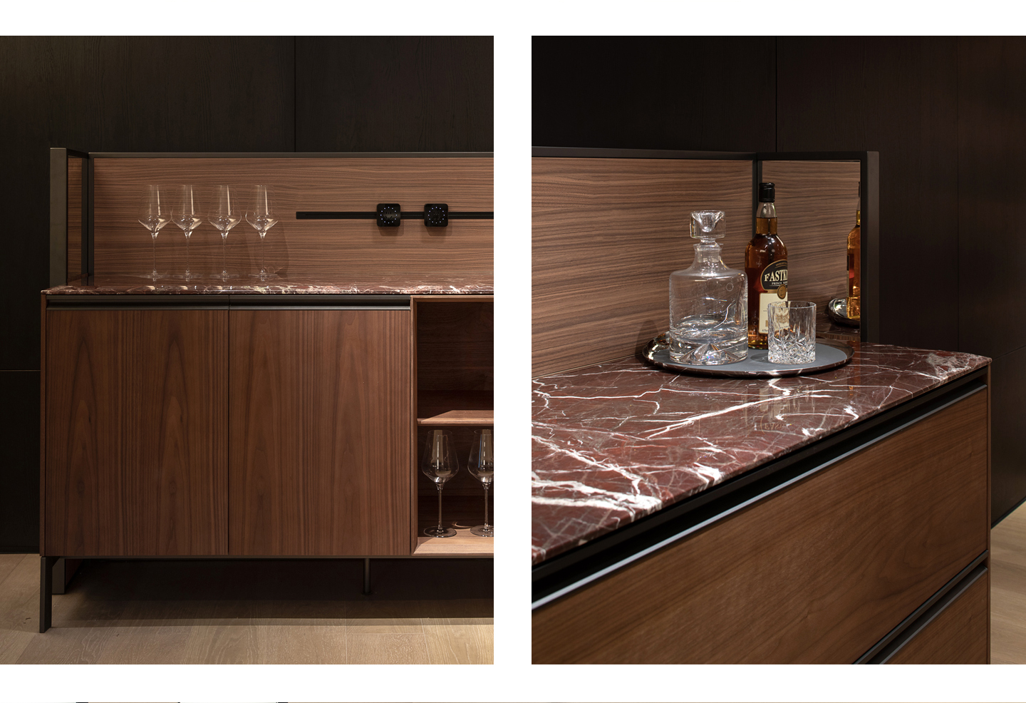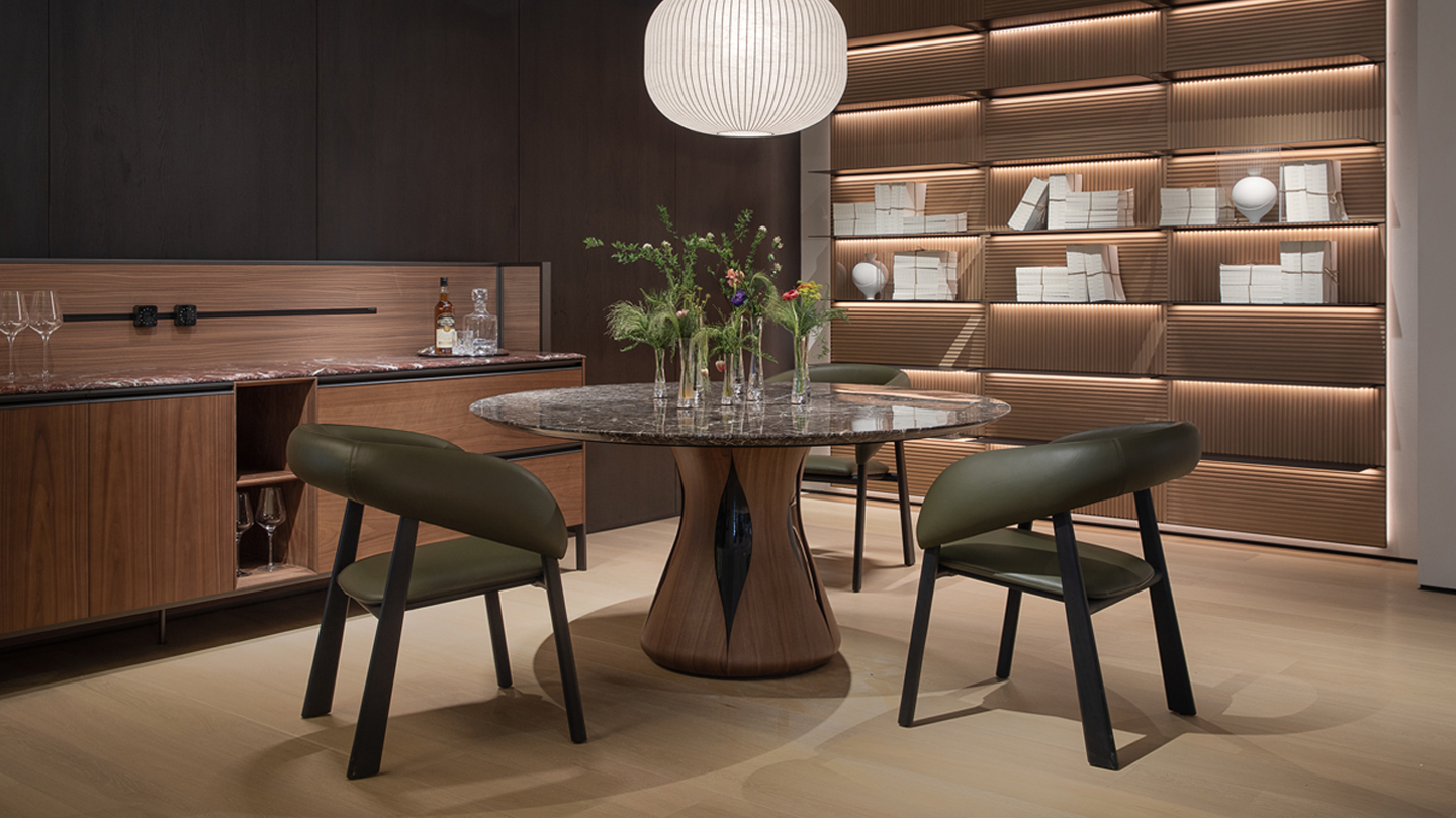 Modular shelving and cabinetry redefine storage into an aesthetic, multi-use hub—shifting between dining, bar, and display.